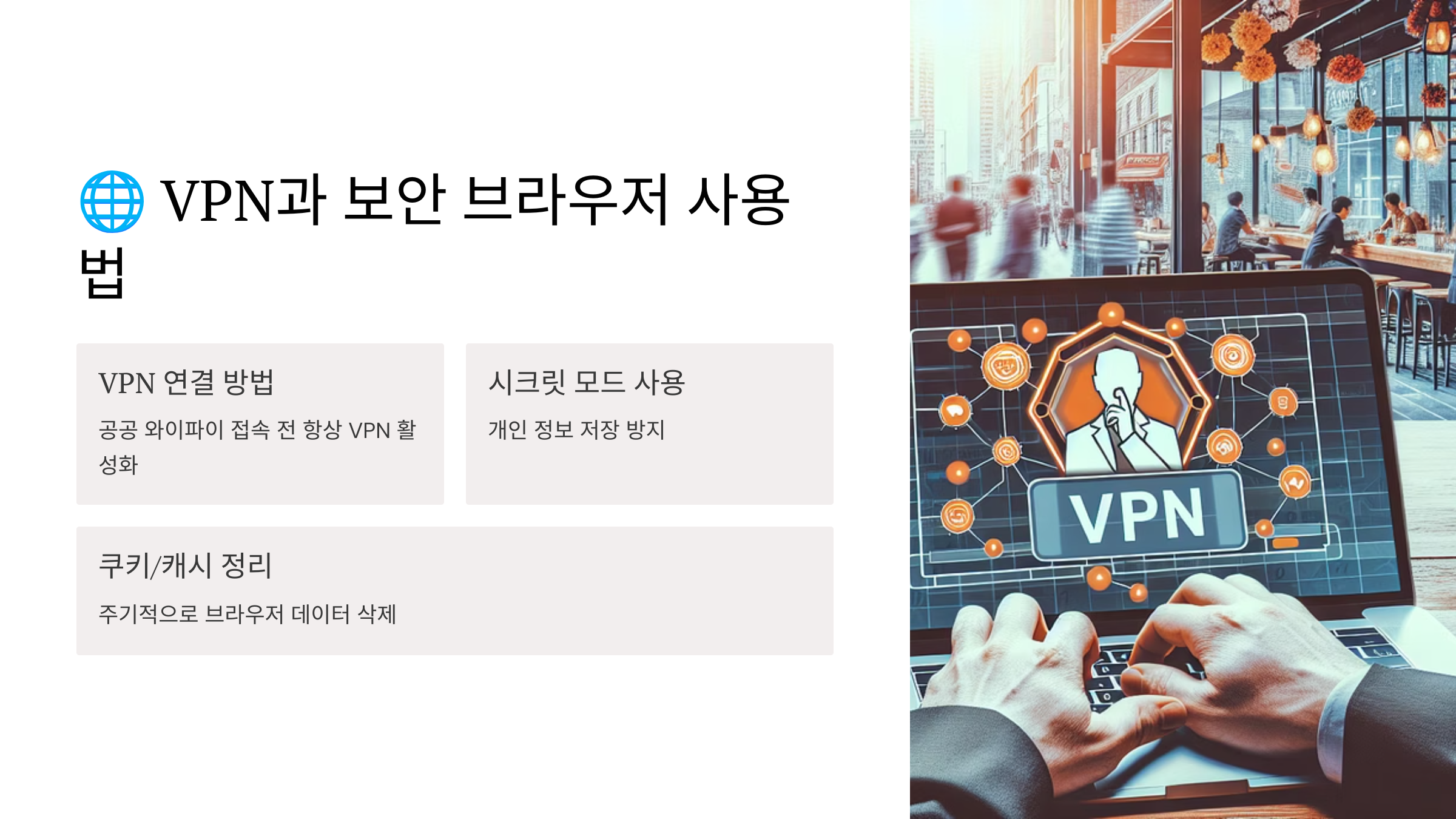공공장소에서의 안전한 인터넷 이용, VPN 하나로도 큰 효과를 볼 수 있어요. 🛡️