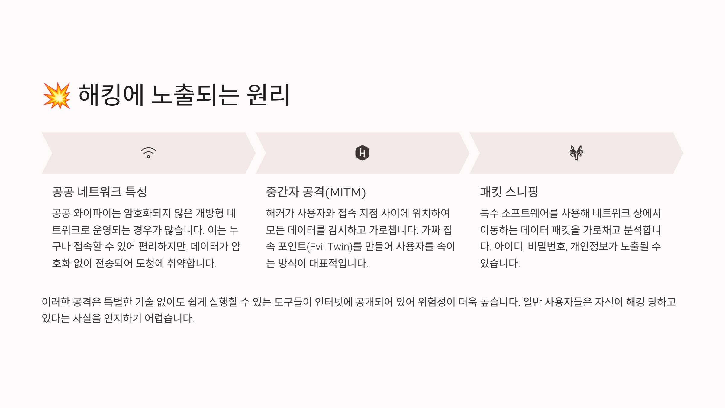 그래서 공공 와이파이를 사용할 땐 “누군가 보고 있다”는 마음가짐으로 행동하는 게 중요해요. 자, 아래 표로 주요 해킹 방식을 다시 정리해볼게요.