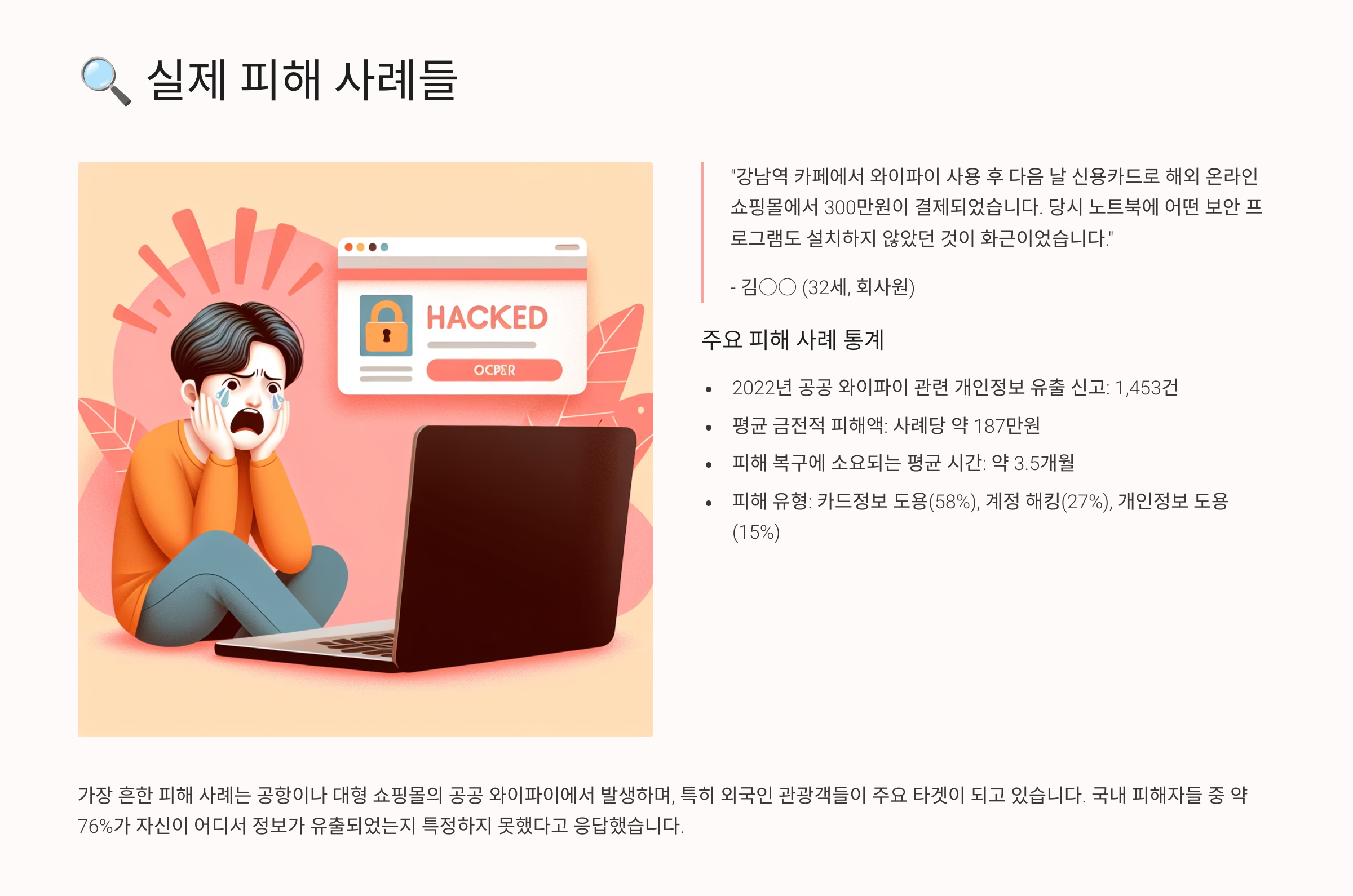 이론적인 정보만으로는 체감이 잘 안 될 수도 있어요. 그래서 실제로 공공 와이파이 사용 중 카드정보나 개인정보가 유출된 사례들을 살펴볼게요. 단순한 실수 하나가 얼마나 큰 피해로 이어지는지 알게 될 거예요. 😰