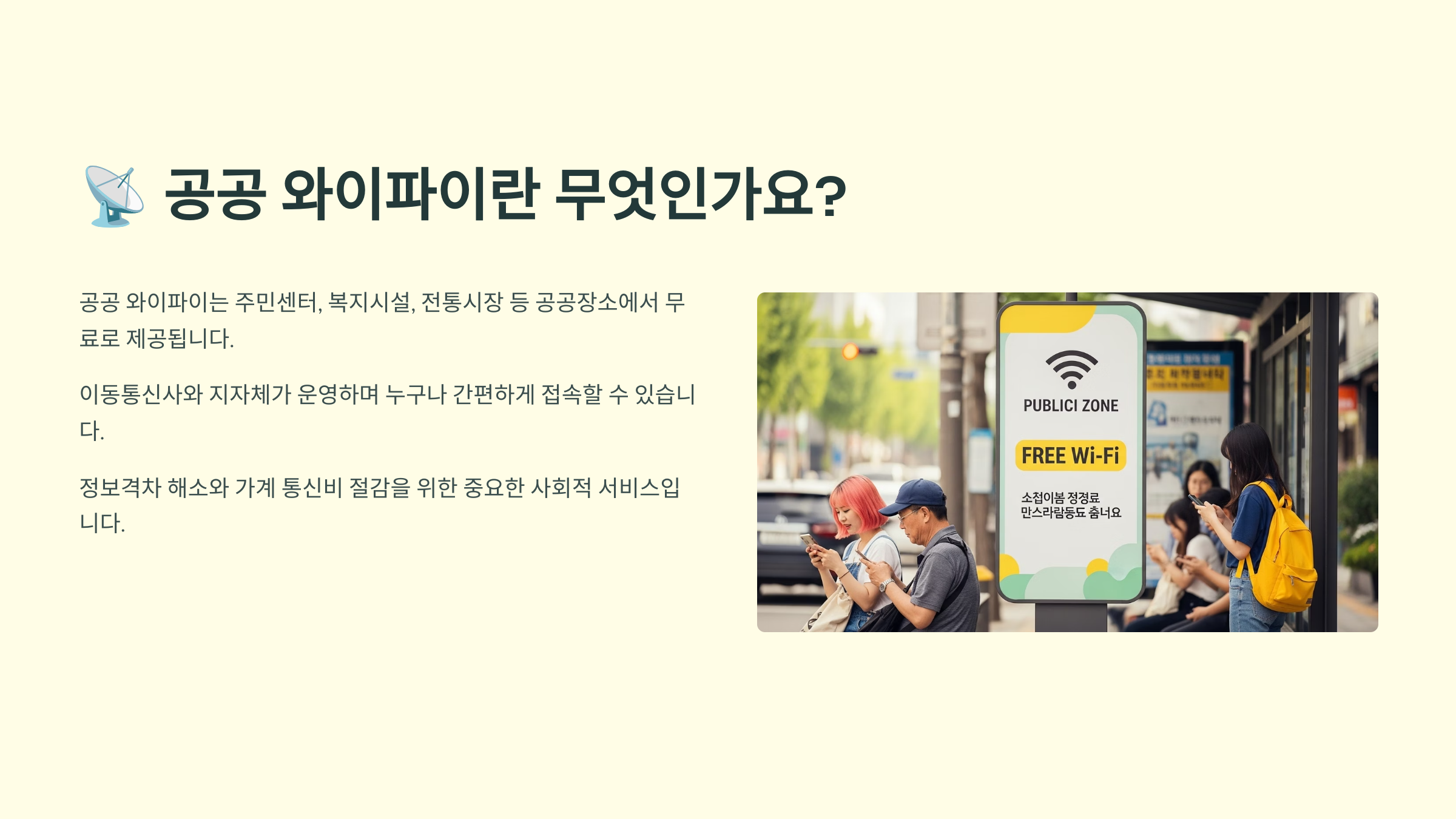 공공 와이파이는 정부, 카페, 지하철, 쇼핑몰, 호텔 등에서 무료로 제공하는 무선 인터넷이에요. 누구나 쉽게 접근할 수 있도록 설정되어 있어서 스마트폰이나 노트북만 있으면 별도 인증 없이 접속할 수 있죠.