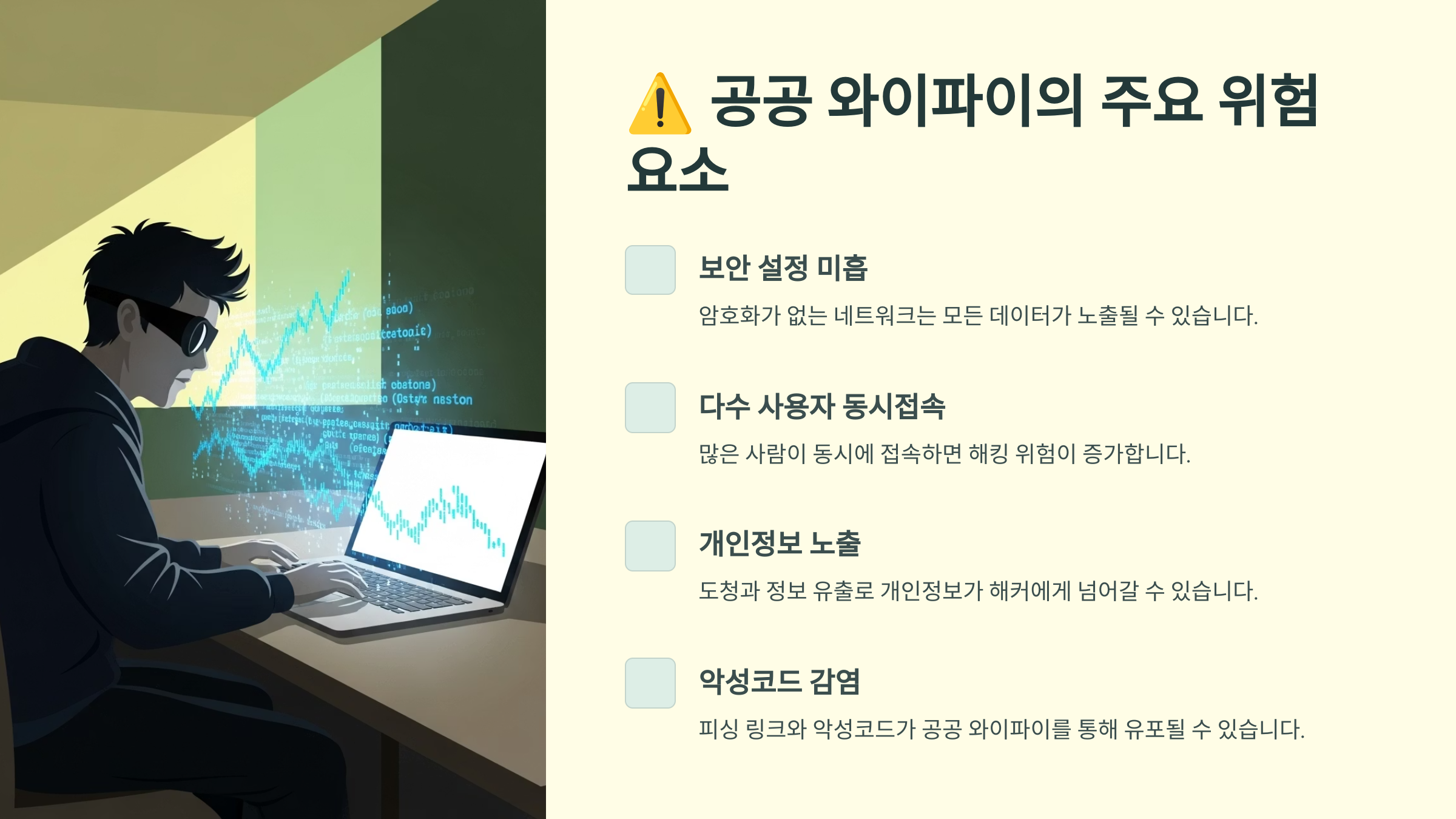 공공 와이파이의 대부분은 WPA2-Personal이나 심지어 아무 암호도 없는 오픈 네트워크 구조를 사용해요. 이는 고급 해킹 장비 없이도 누구나 패킷 분석이나 중간자 공격이 가능한 구조라는 거예요.
