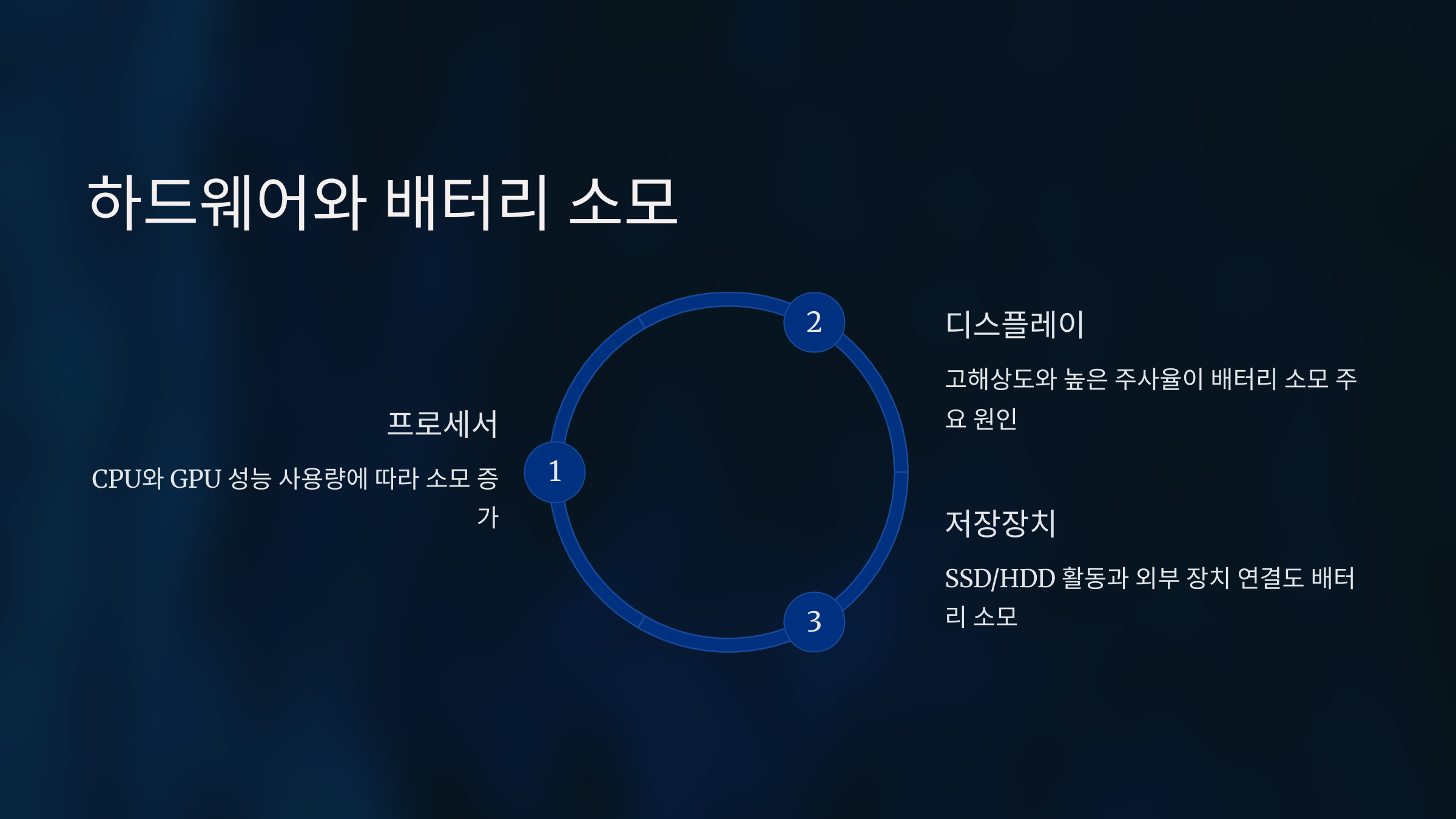 SSD, 램, 외장 그래픽, 키보드 백라이트, 연결된 블루투스 장치 등도 모두 배터리에 영향을 줘요. 특히 블루투스 마우스나 이어폰이 연결되어 있을 때는 소모가 눈에 띄게 늘어요.