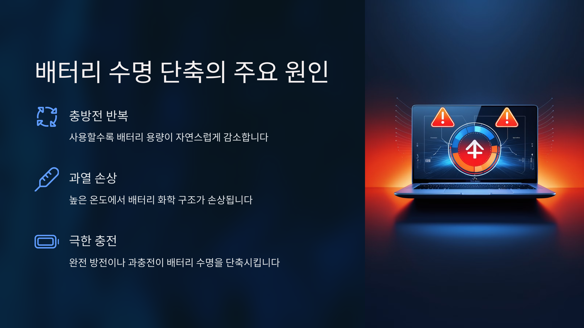 노트북 배터리가 빠르게 닳는 가장 큰 이유는 바로 '화학적 노화'예요. 충전과 방전이 반복될수록 내부의 리튬이온 활동성이 떨어지고, 그만큼 충전 용량도 줄어들어요.