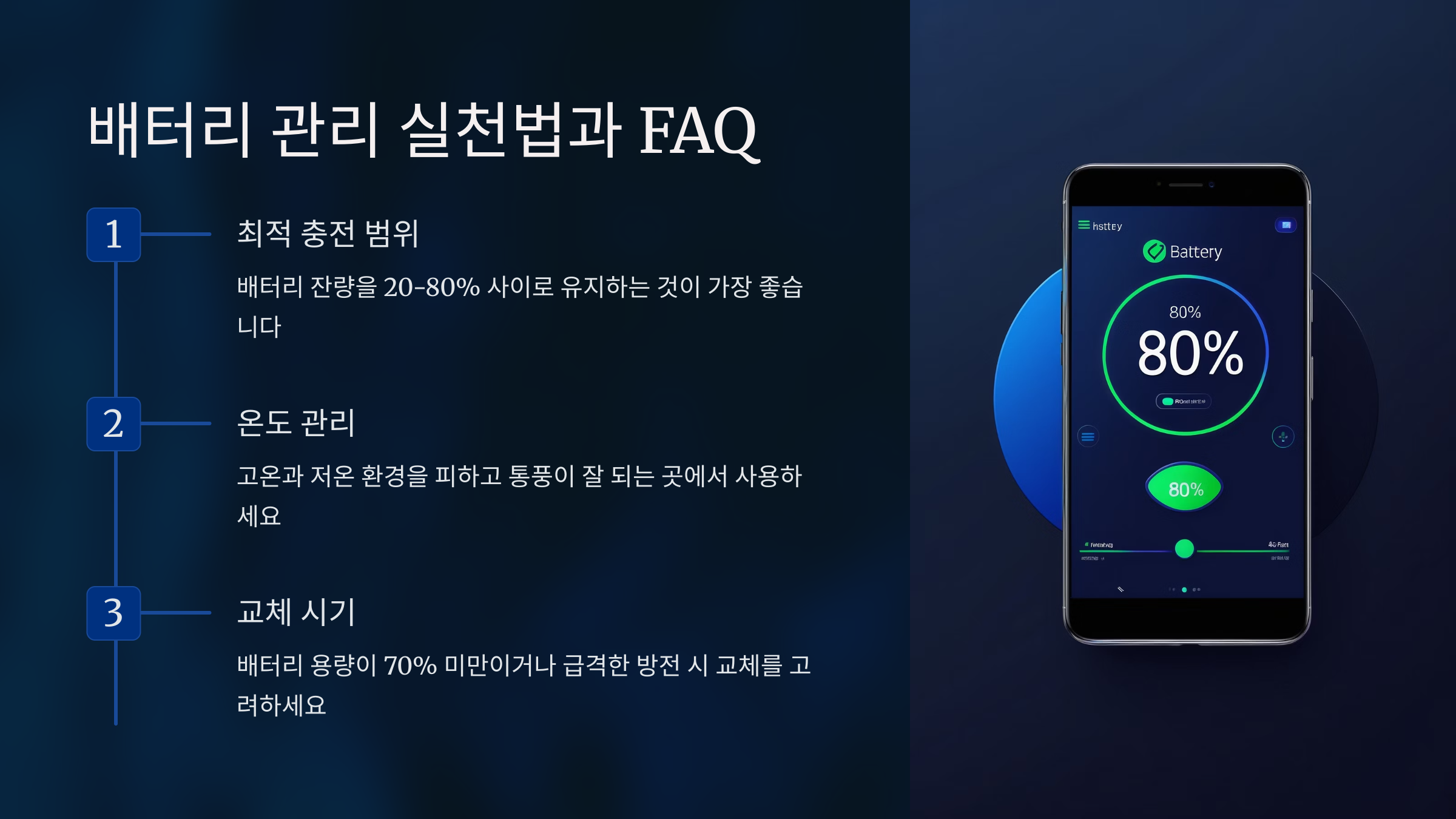 이런 관리 팁은 장기적으로 봤을 때 배터리 교체 시기를 1~2년 이상 늦출 수 있는 효과가 있어요. 🧠