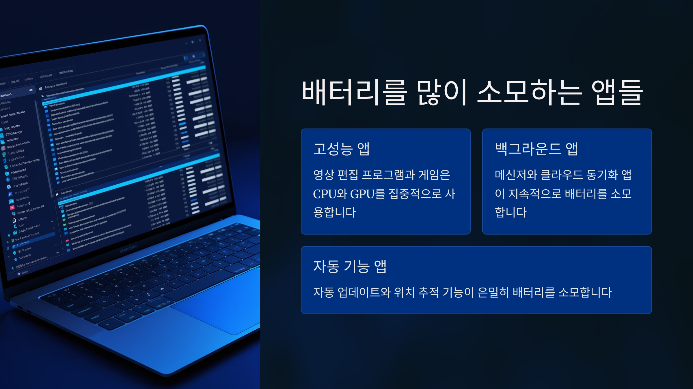 노트북을 사용하는 동안 배터리를 조용히 갉아먹는 앱들이 있어요. 이 앱들은 눈에 띄지 않지만, 배터리 소모의 주범이 되기도 해요.