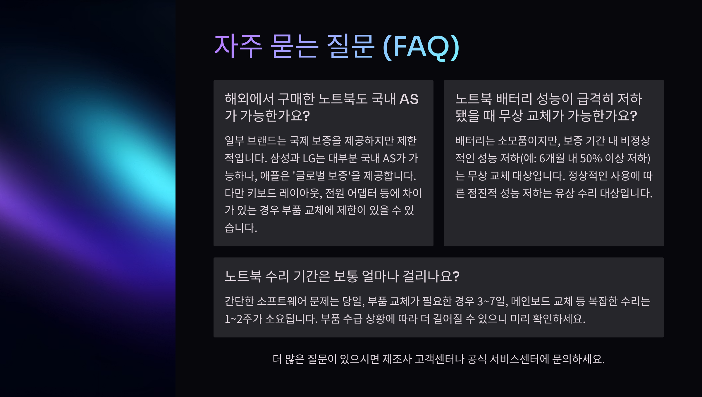 예를 들어 삼성전자는 노트북 대부분에 1년 보증을 제공하고, 고급 라인업(갤럭시북 시리즈 일부)에는 프로모션 기간 중 2년까지 무상 수리 보장을 해주기도 해요. LG전자 역시 울트라PC 및 그램 모델의 경우, 배터리나 주요 부품에 대해 추가 보증이 제공되는 경우가 있어요.
