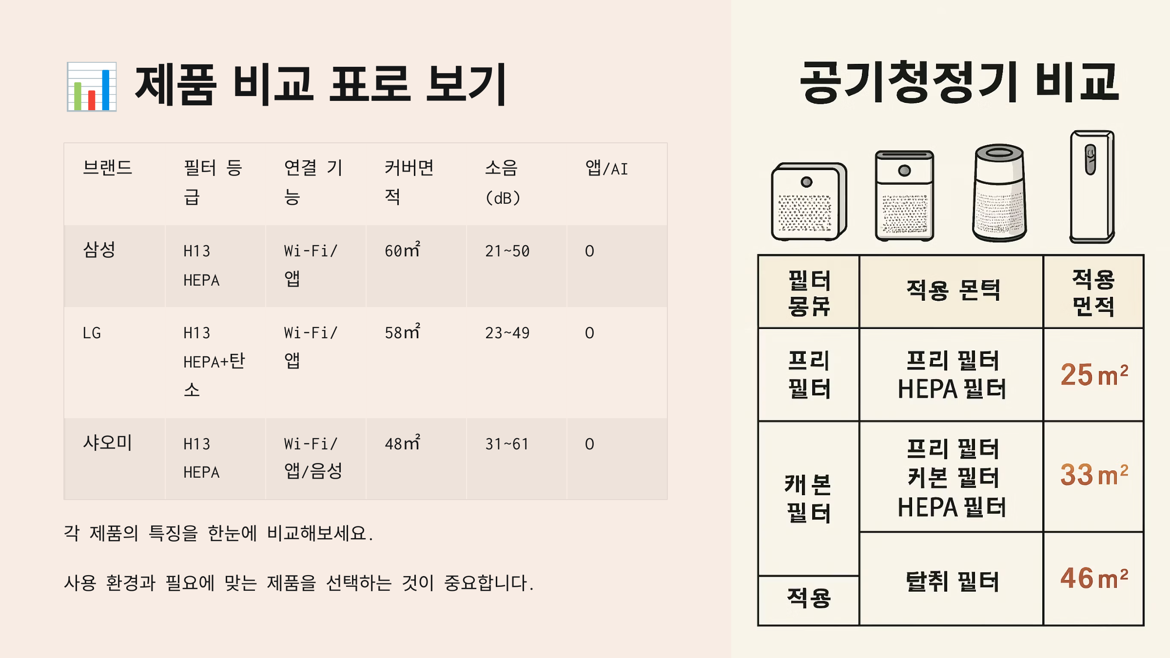 아래 비교표는 가격, 성능, 공간 커버 범위, 앱 연동, 필터 등 모든 요소를 종합해 정리한 거예요. 스펙을 꼼꼼히 비교해서 현명하게 선택해보세요! ✍️