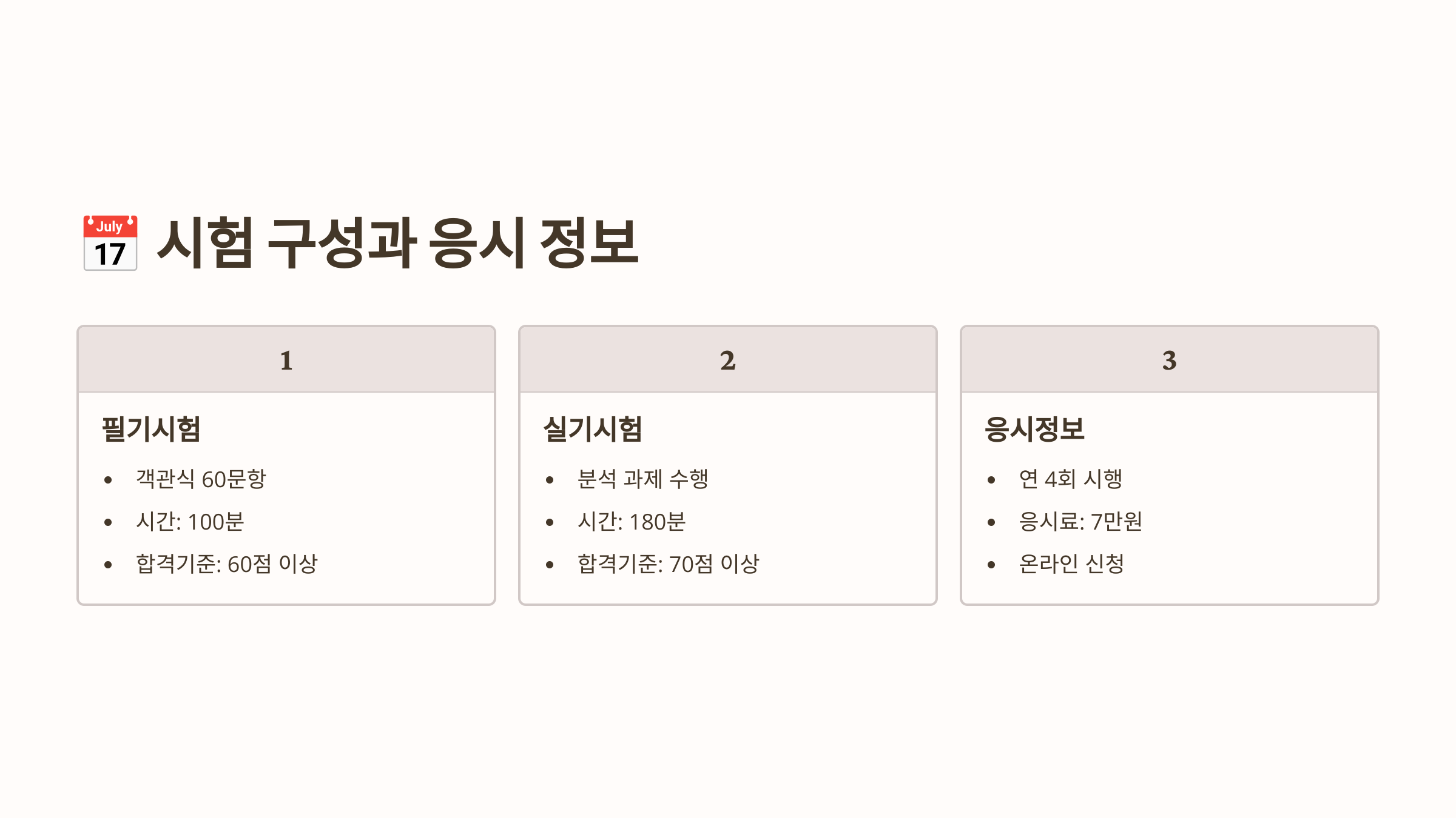 | 합격 기준 | 평균 60점 이상 + 과락 없음 | 필기 + 실기 모두 60점 이상 |