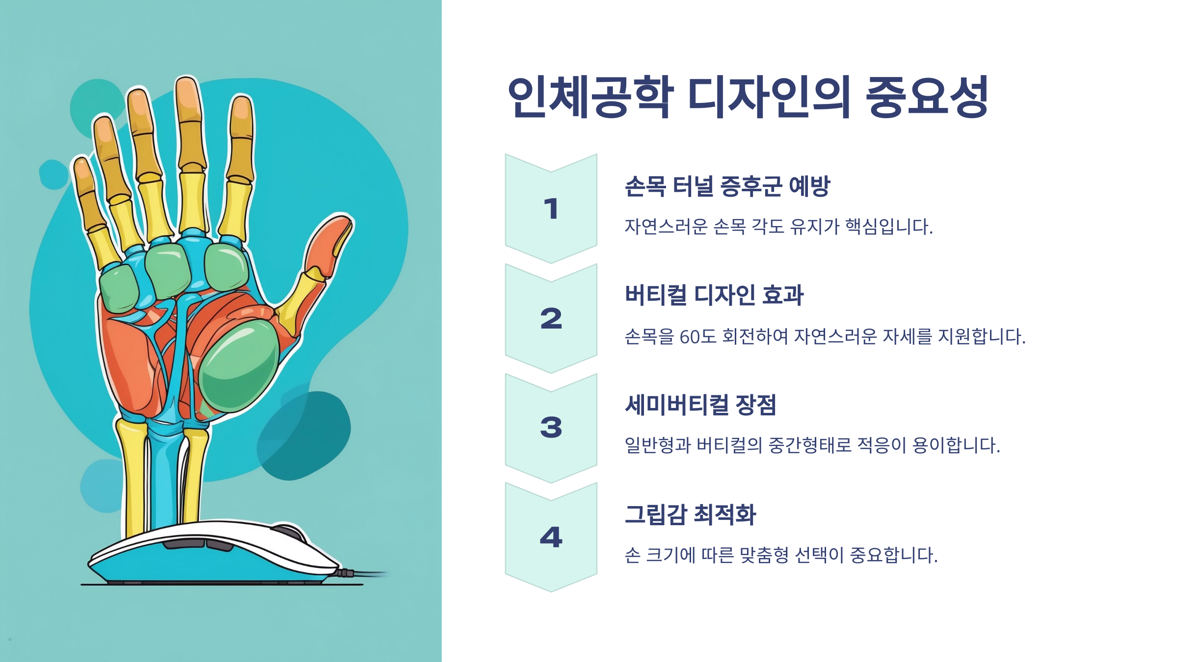 특히 수직형(Vertical) 마우스는 손목을 비틀지 않아도 되어 손목 터널 증후군 예방에 효과적이랍니다.