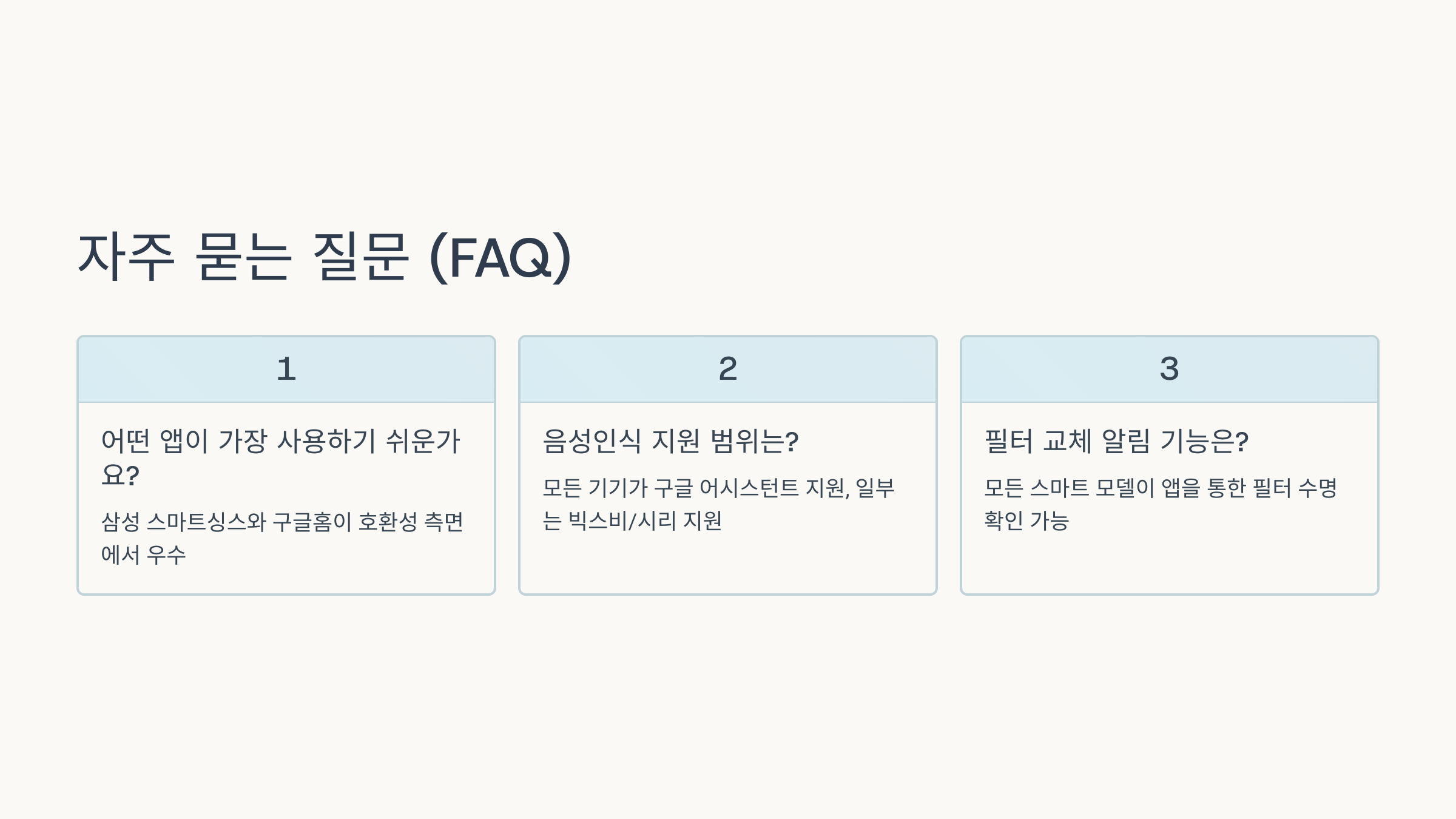 A1. 구글홈은 음성명령 기반의 스마트 허브이고, 스마트싱스는 삼성 스마트 기기 중심의 통합 제어 플랫폼이에요. 둘 다 공기청정기 연동이 가능해요.