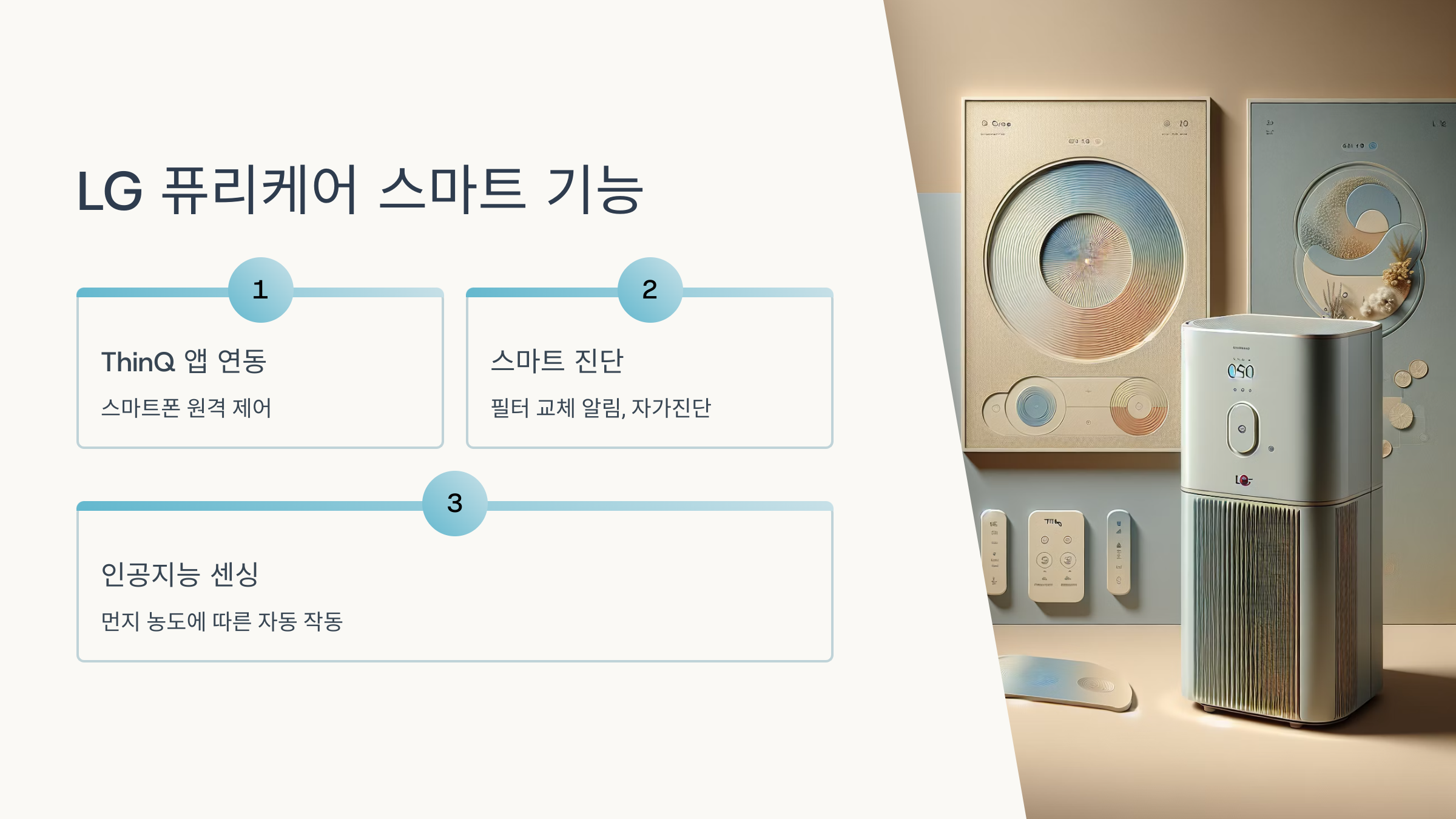 LG 퓨리케어 공기청정기는 ‘정밀한 공간제어’와 ‘세련된 연동 기능’이 가장 큰 강점이에요. 특히 듀얼 청정 시스템으로 위·아래 공기를 동시에 빠르게 정화해주고, 스마트씽큐(LG ThinQ) 앱을 통한 제어가 굉장히 섬세하답니다.