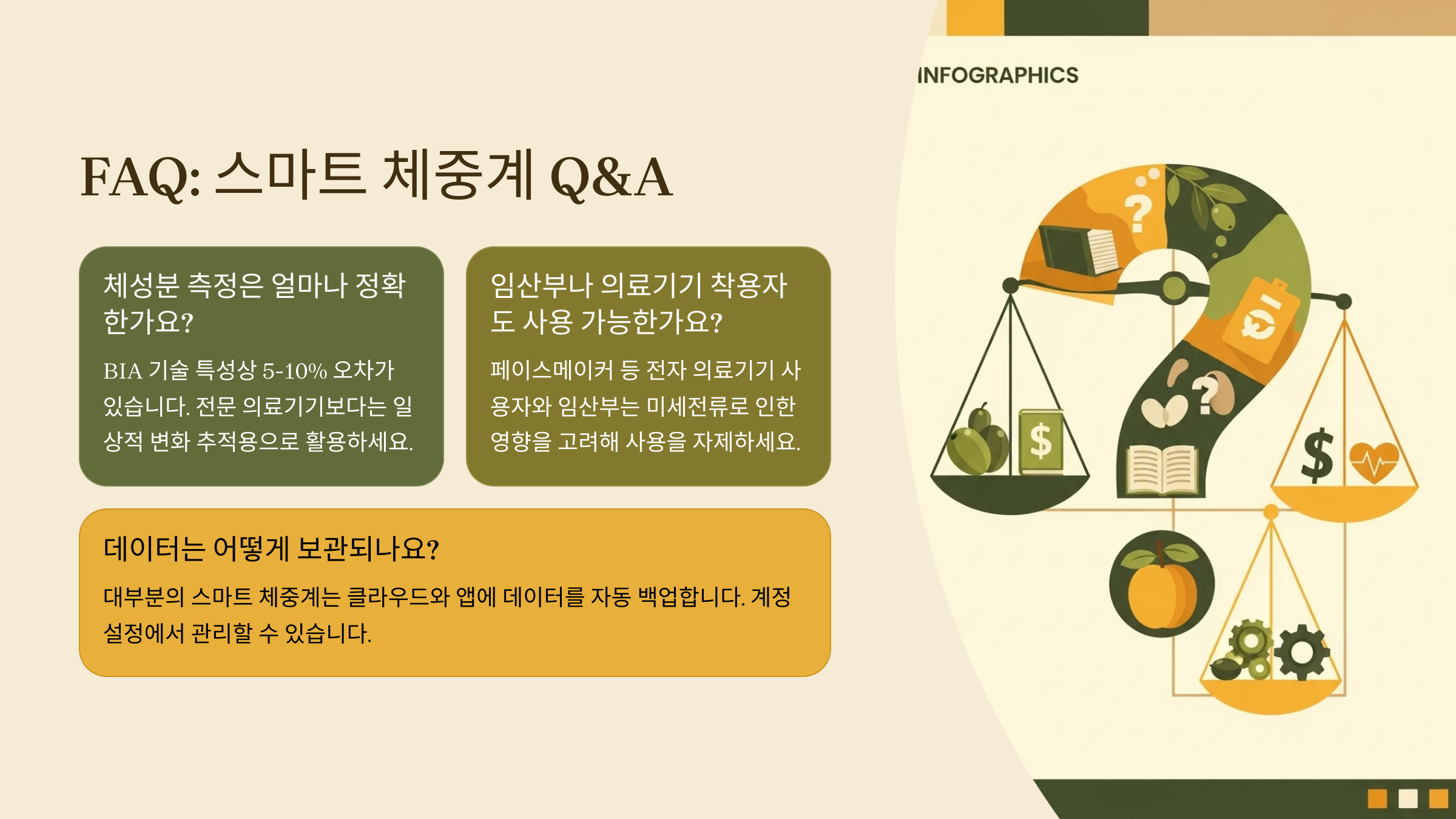 최근에는 체중계에 AI가 적용되어, 수면 패턴, 활동량과 같은 다양한 생활 습관 데이터까지 통합 분석하려는 시도도 이어지고 있어요. 단순히 '얼마나 쪘나' 확인하는 시대는 끝났고, '어떻게 더 건강해질까'를 고민하는 시대가 온 거예요. 😊