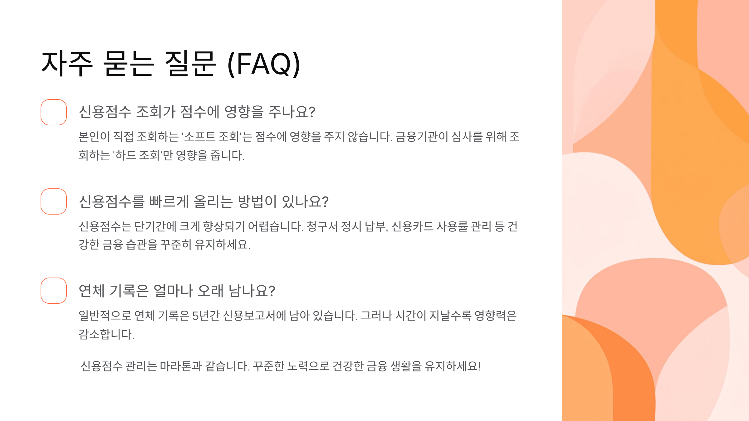 이외에도 대출을 받을 땐 상환기간을 짧게, 연체가 예상될 땐 바로 상담 요청하기 등 실천 가능한 작은 습관들이 모여 점수 향상에 기여해요.
