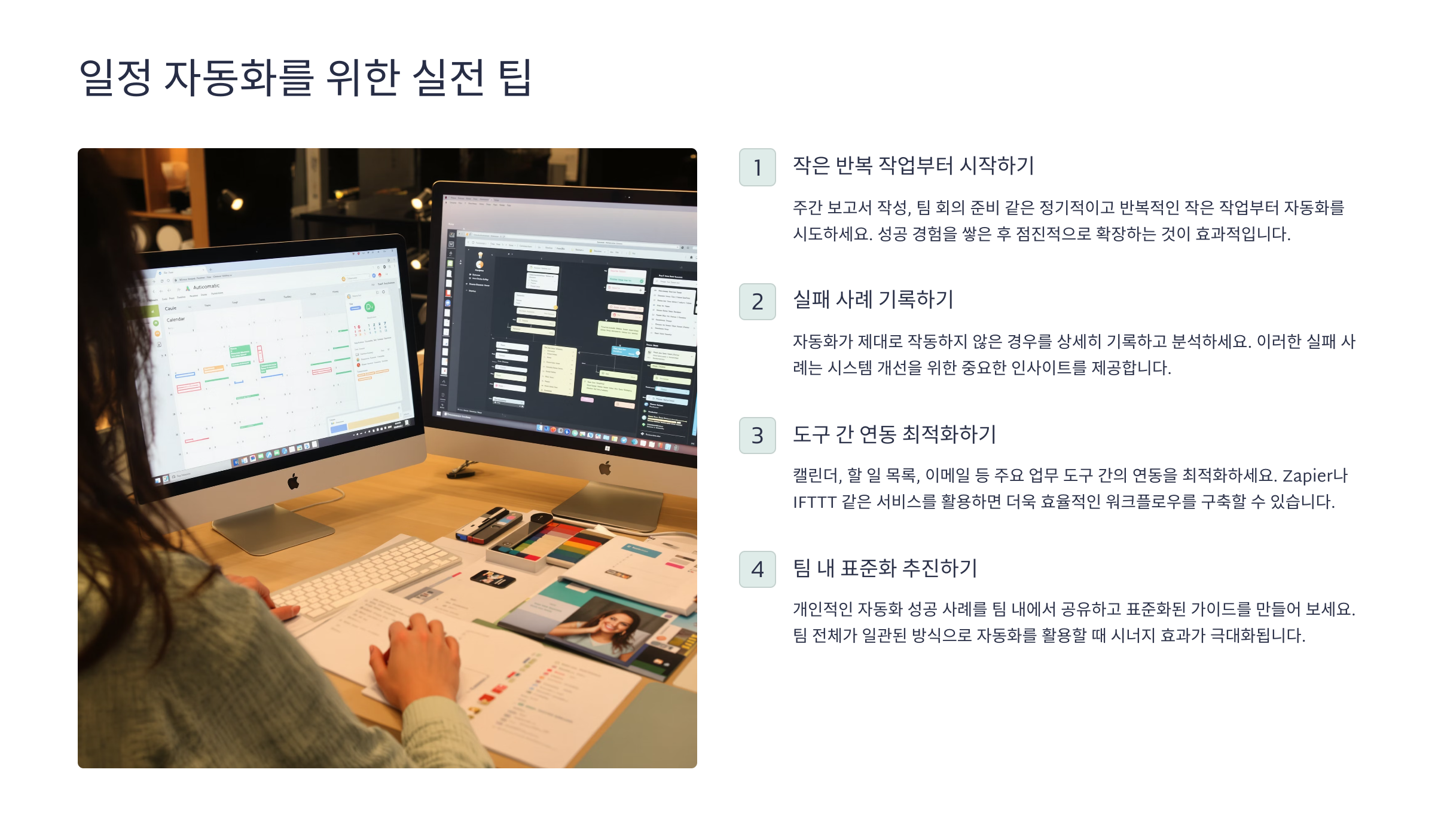 단순히 일정을 정리하는 게 아니라, 팀의 루틴 전체를 설계하는 것. 그게 진짜 일정 자동화의 힘이에요. 그래서 2025년, 많은 기업들이 업무 자동화 매니저라는 직책을 새롭게 만들고 있대요! 📈