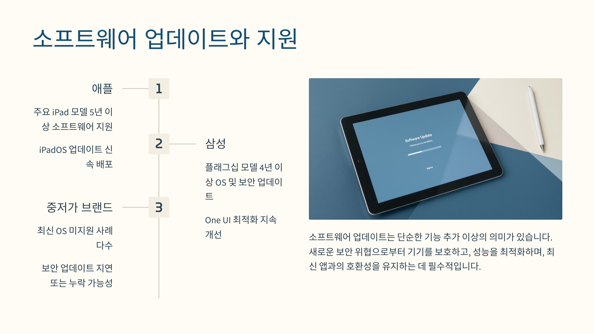 다음 세션에서는 소프트웨어 업데이트와 지원이 왜 그렇게 중요한지, 그리고 그것이 내 태블릿 수명에 어떤 영향을 주는지 알아볼게요 🔄