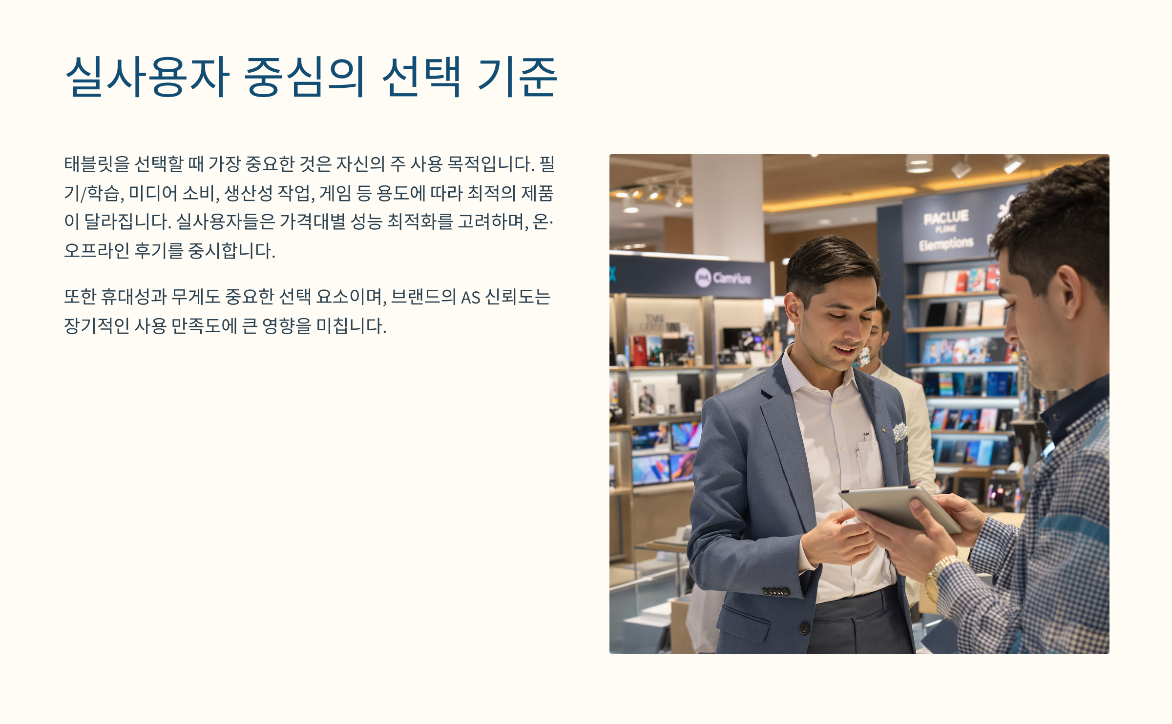 물론 크기나 성능도 여전히 중요한 기준이긴 하지만, 이는 선택의 기준 중 일부일 뿐이에요. 어떤 사람은 무겁더라도 넓은 화면이 필요할 수 있고, 어떤 사람은 가벼워서 침대에서도 들고 쓰기 편한 게 더 좋을 수도 있어요.