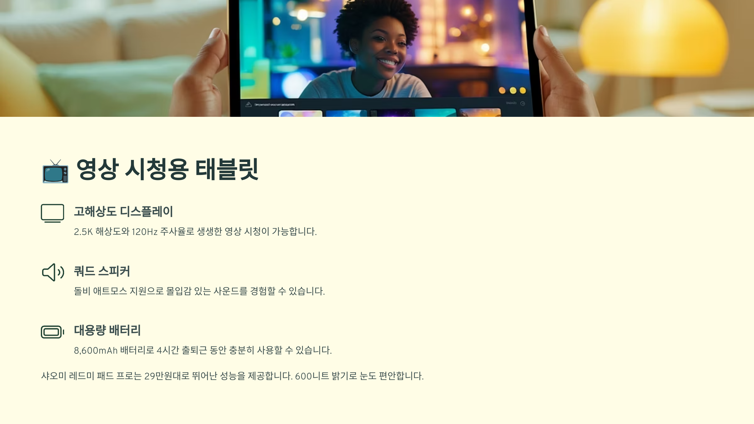 영상 시청용으로 태블릿을 찾는다면 가장 중요한 건 큰 화면과 선명한 화질이에요. 화면 크기가 커야 몰입감이 좋고, 해상도가 높으면 영화나 드라마를 볼 때 디테일한 표현까지 느낄 수 있어요. 그리고 스피커 성능도 무척 중요해요. 스테레오 스피커가 양쪽에 배치돼 있으면 더 생생한 사운드를 들려줘요.