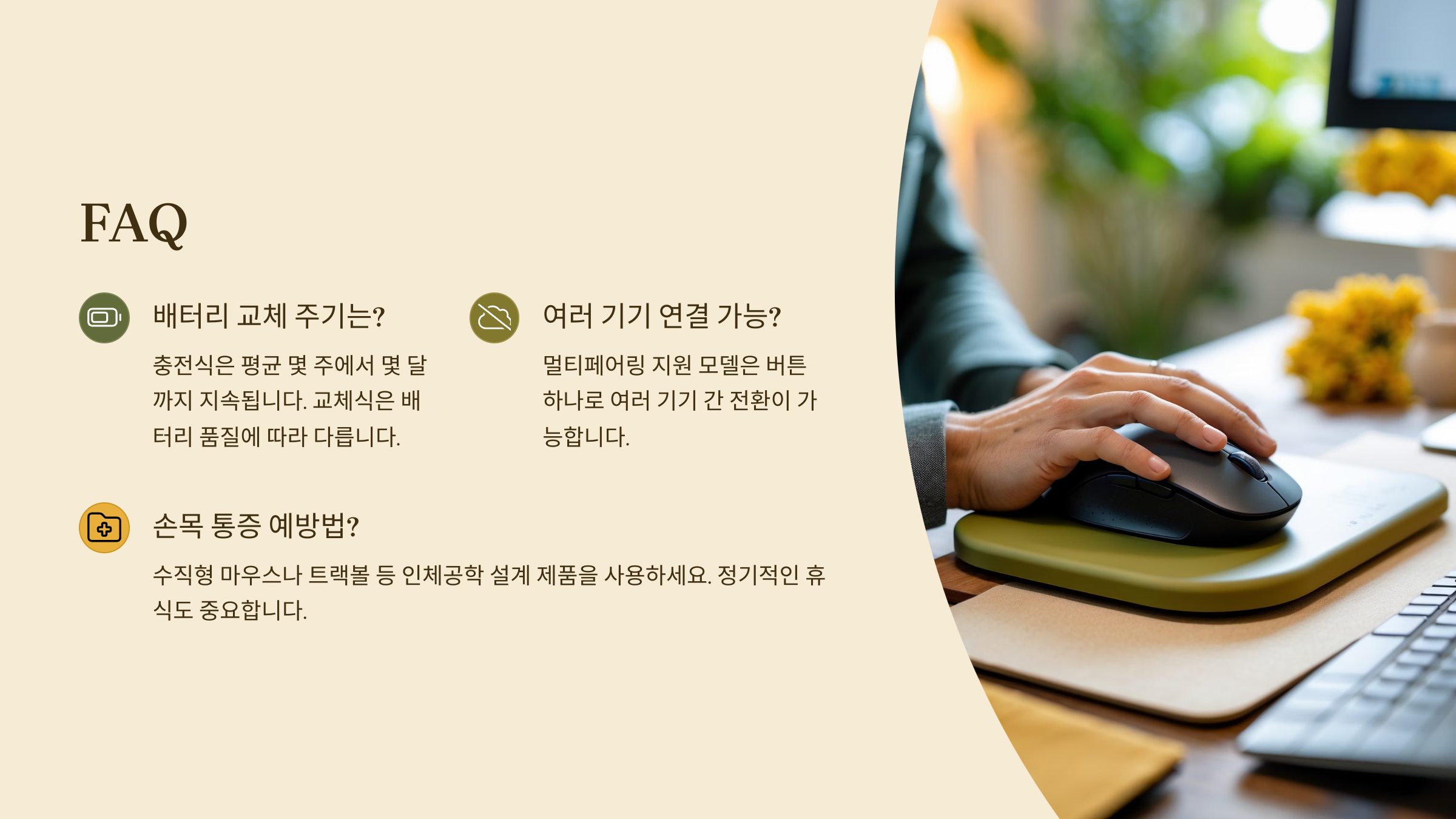 이렇게만 꼼꼼히 체크하면 나에게 딱 맞는 무선마우스를 고를 수 있어요. 마지막으로 FAQ 섹션에서 자주 묻는 질문과 답변도 확인해 봐요! 🔍