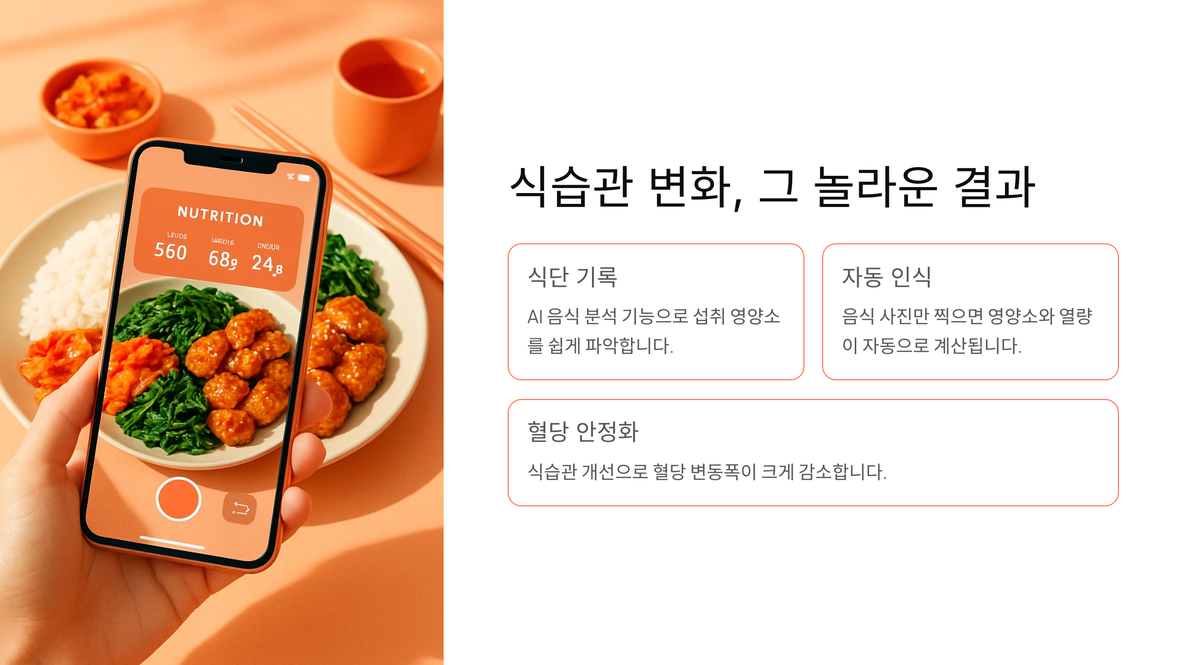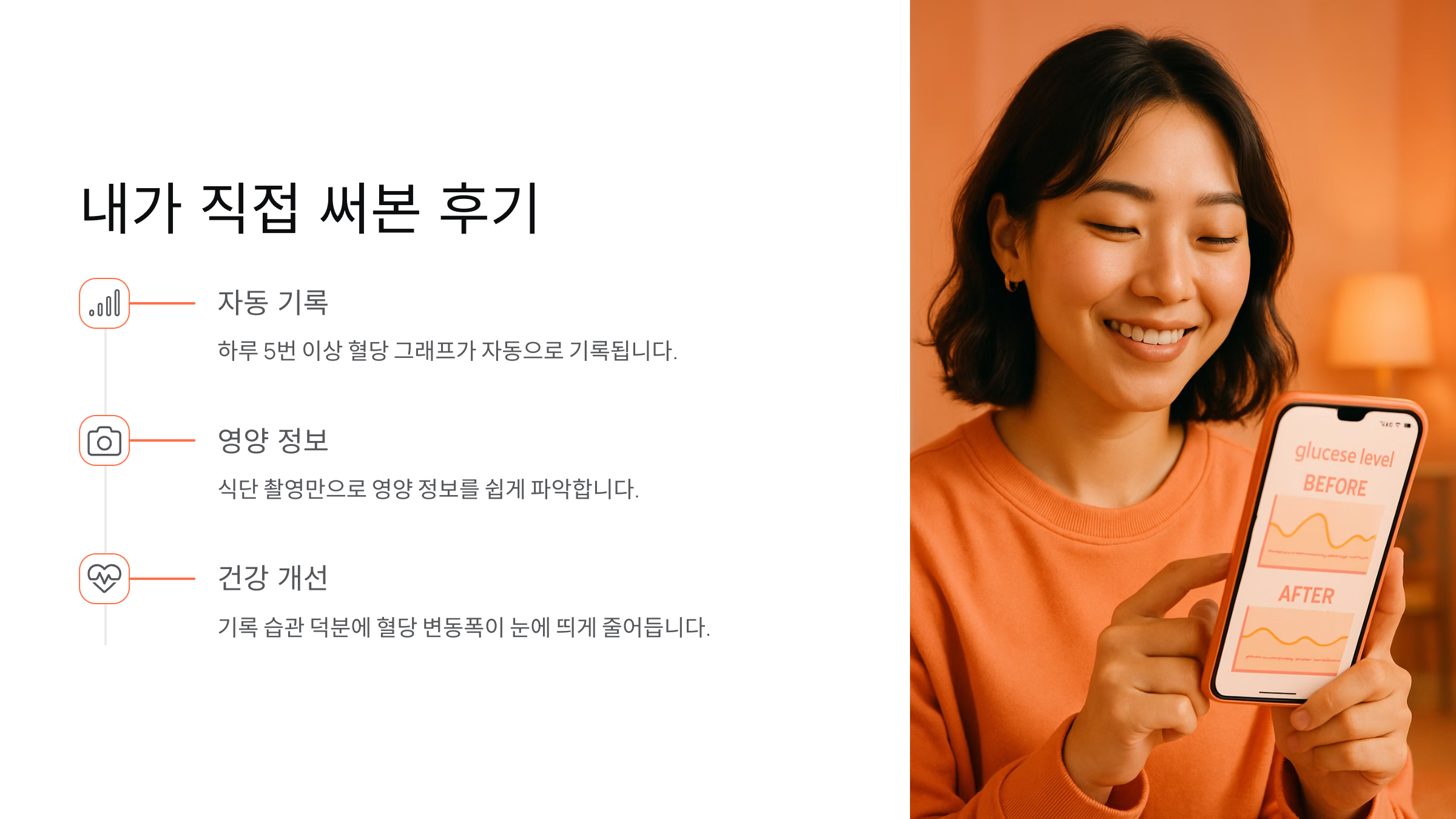 혈당 수치가 올라갈 때마다 앱에서 알림이 오니까 자연스럽게 식사 전후에 신경을 쓰게 됐고, 물도 자주 마시게 됐어요. 앱을 시작하고 한 달쯤 지나자 체중도 2kg 정도 빠졌고, 소화도 훨씬 잘됐어요.