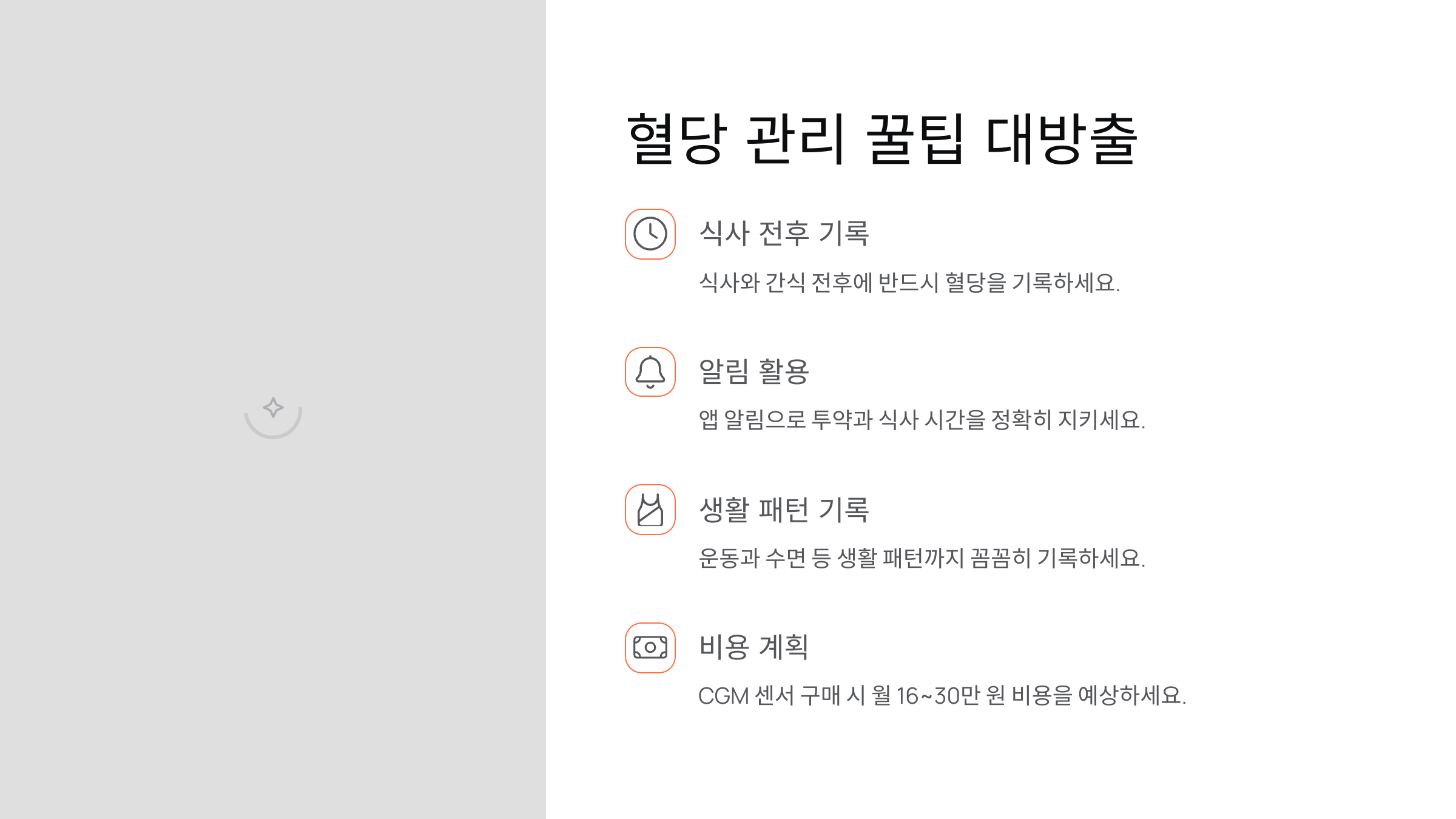⑧ 하루 5분, ‘혈당 다이어리’를 작성해보세요. 혈당 수치만 쓰는 게 아니라, 왜 올랐는지 이유까지 적어보면 습관 패턴이 눈에 보여요. 나를 더 잘 이해할 수 있는 시간이 되죠.