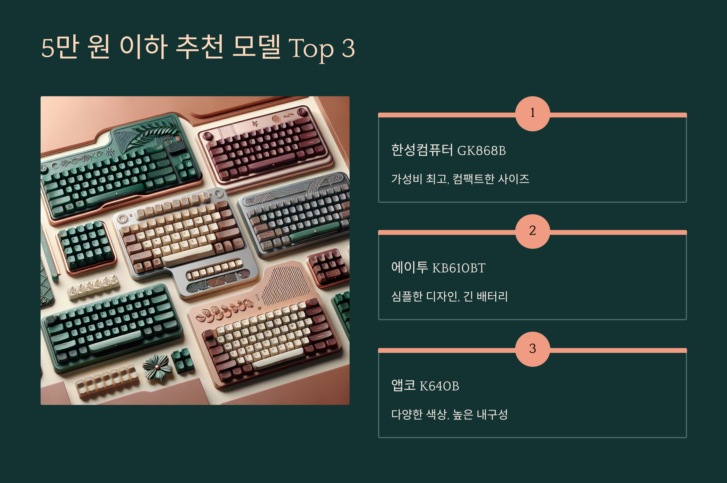 기계식이나 멀티페어링 기능까지 원하는데 예산이 10만 원 이하라면, 아래 3가지 모델은 정말 만족도가 높아요. 다양한 기능은 물론, 타건감까지 탄탄하게 챙긴 가성비 모델들이에요.