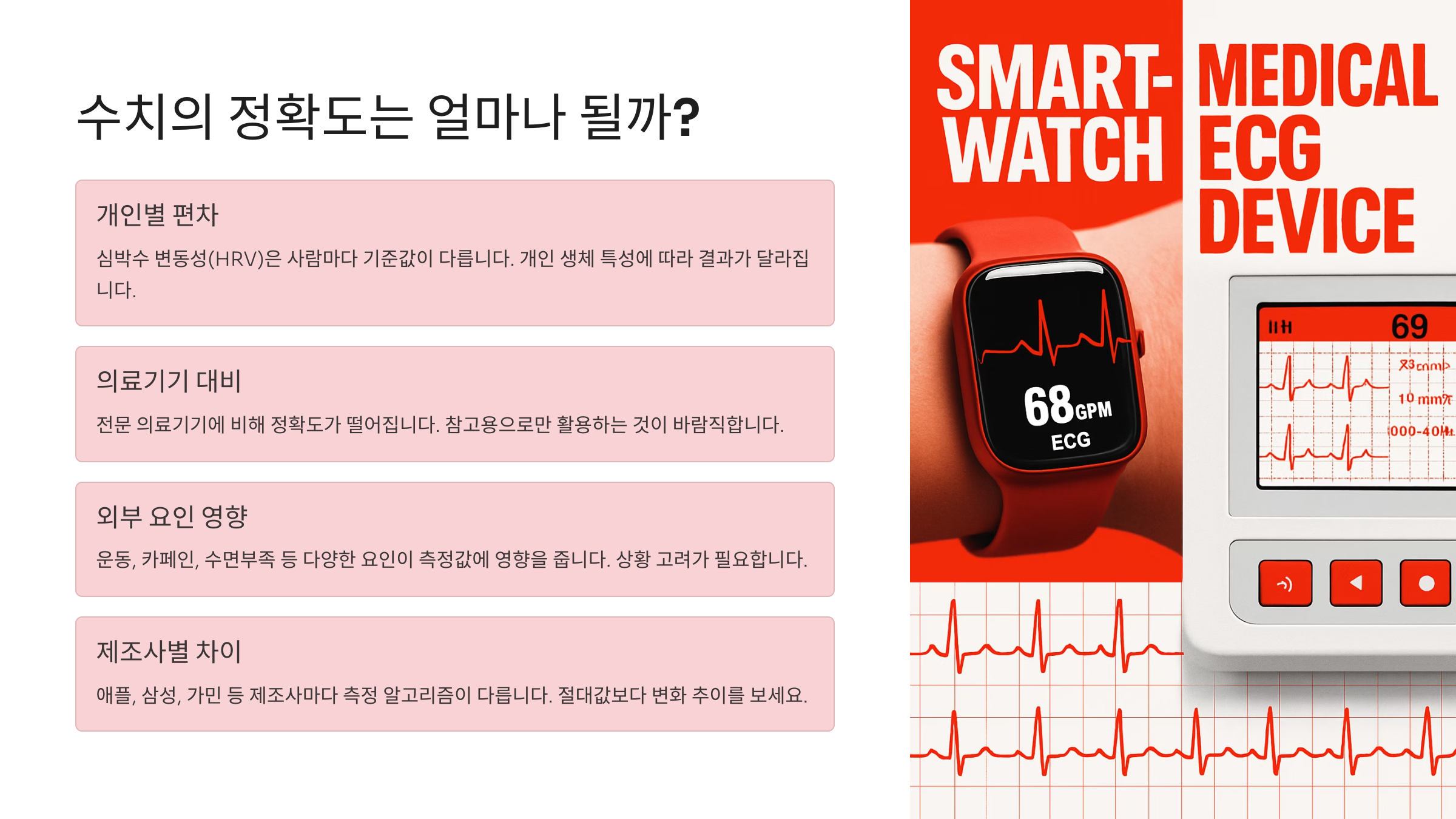 HRV(심박변이도)는 의료 분야에서도 자율신경계 건강 상태를 평가할 때 활용되는 지표이긴 하지만, 측정 환경에 따라 값이 달라질 수 있어요. 손목에 스마트워치를 너무 느슨하게 착용하거나 움직임이 많은 경우, 데이터에 오차가 생길 수 있답니다.