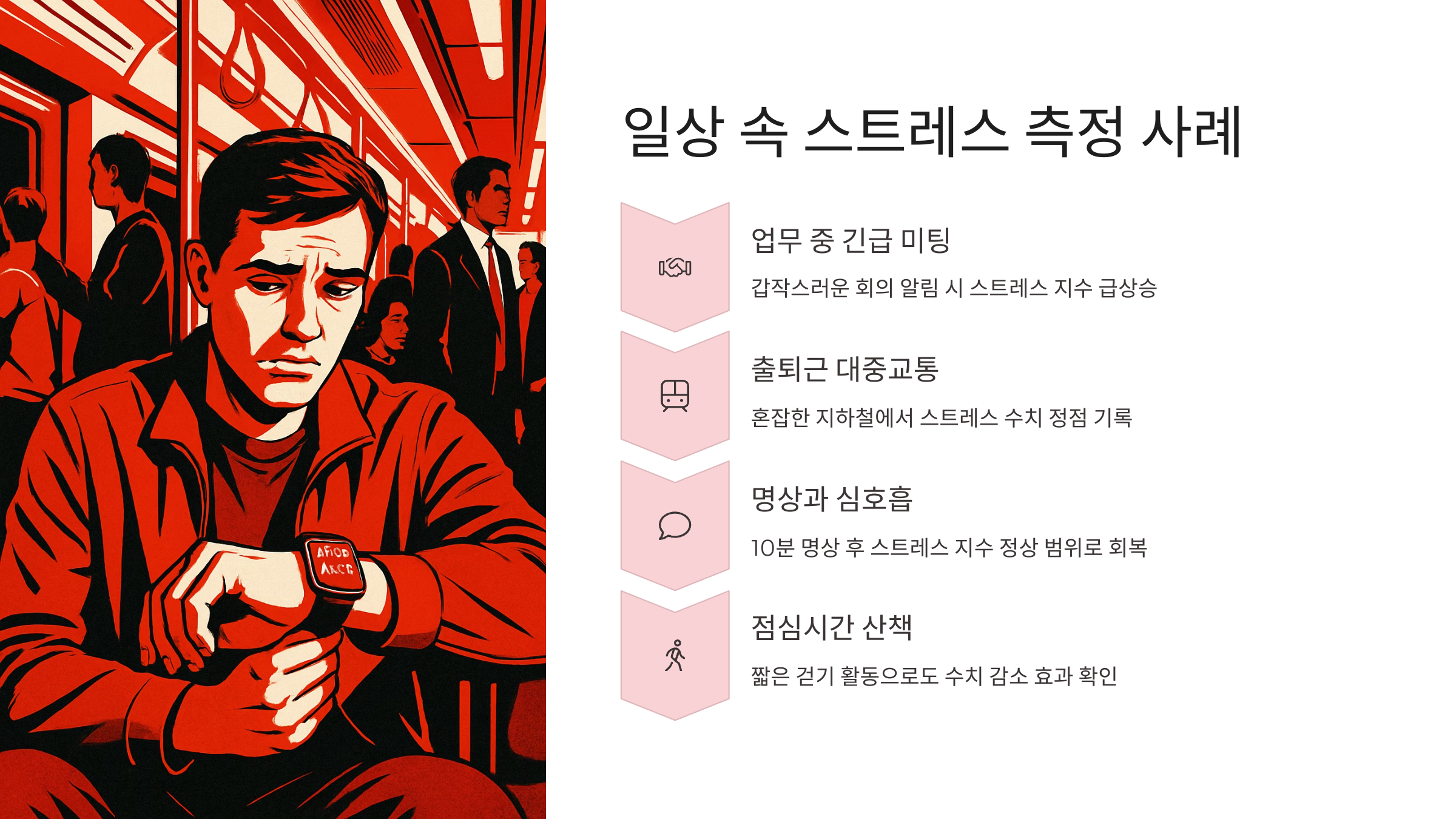 한 직장인은 회의와 야근이 많은 시기 동안 스트레스 수치가 평균 92를 기록했는데, 어느 날 갑자기 공황발작이 찾아왔다고 해요. 다행히 스마트워치의 경고를 무시하지 않고 병원을 찾은 덕분에 큰 사고는 막을 수 있었어요. 기계가 사람을 구한 사례죠.