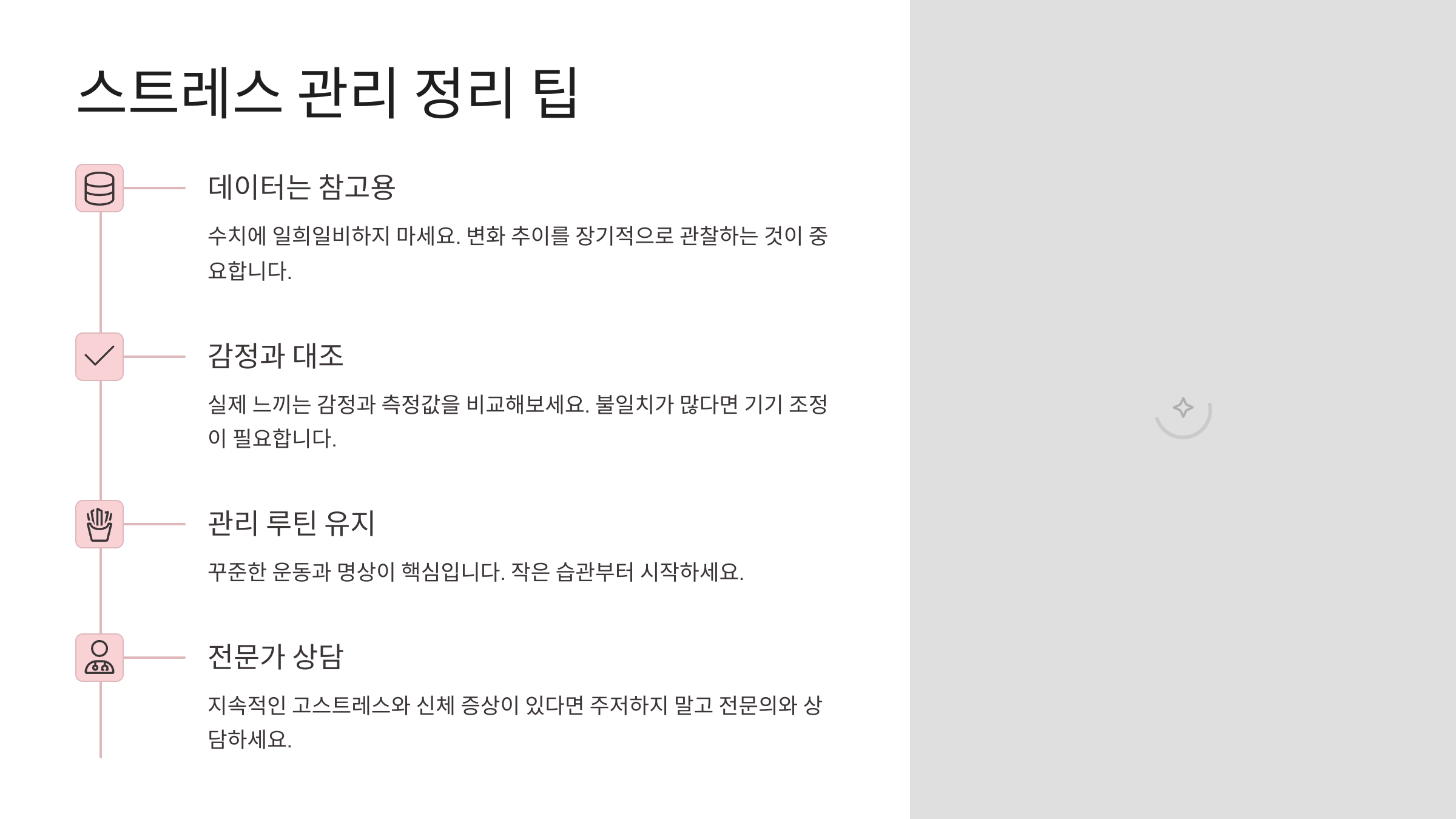 하루에 하나씩 실천해보면 어느새 수치도, 기분도 달라져 있을 거예요. 스트레스, 피할 수 없다면 잘 관리해보자고요! 🧡