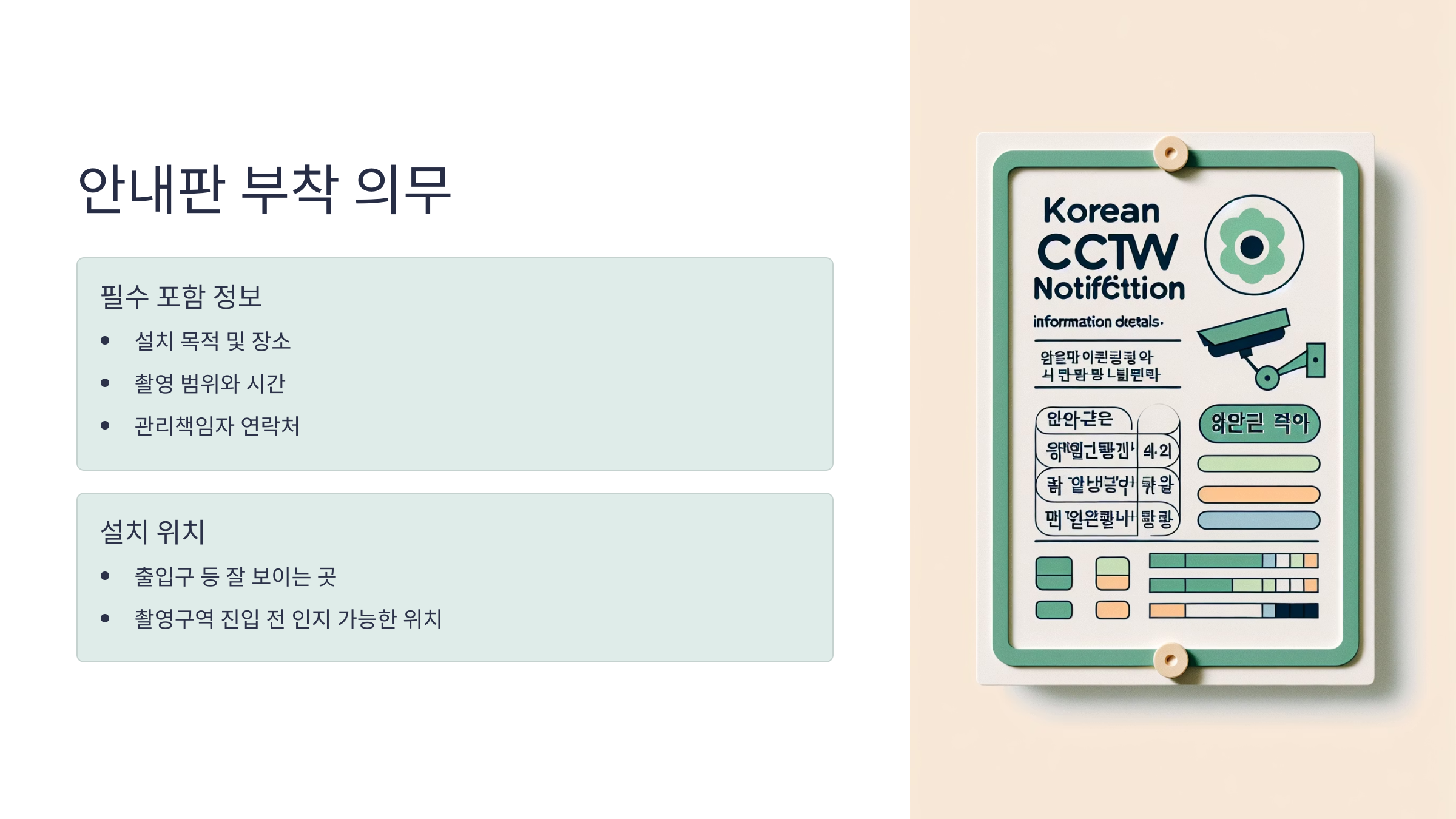 안내판에는 최소한 ‘설치 목적’, ‘촬영 범위’, ‘촬영 시간’, ‘관리자 연락처’가 포함돼야 해요. 이런 정보가 빠지면 법적으로 미설치와 동일하게 간주돼요.