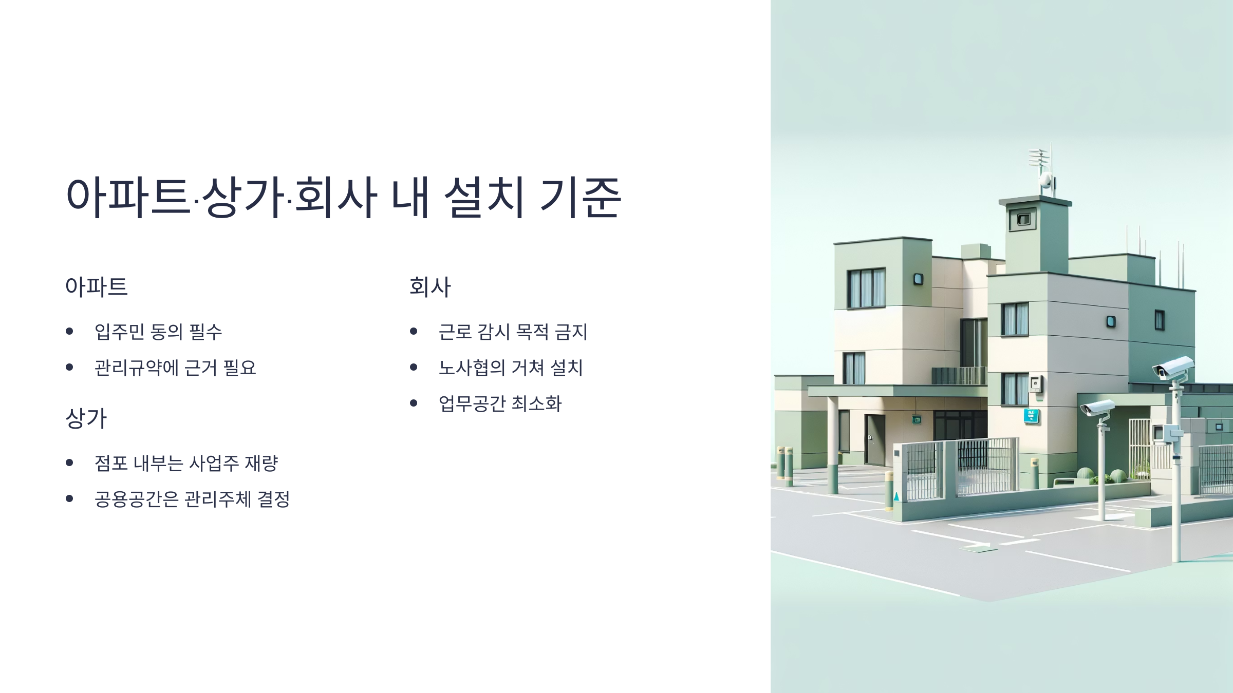 공동주택, 상가, 회사 등은 모두 법률에 따라 CCTV 설치 기준이 달라요. 아파트는 주민 동의가 중요하고, 회사는 직원 사생활 보호가 핵심이죠.