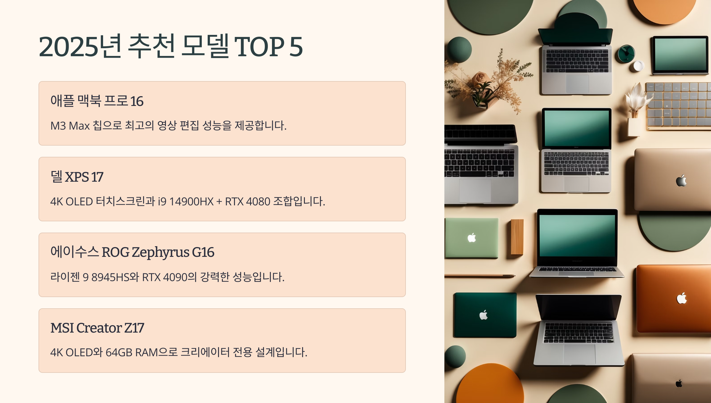 이제 진짜 본격적으로! 2025년 현재 최고로 손꼽히는 영상 편집 노트북 5종을 소개할게요. 이 중 하나는 분명 당신의 작업 스타일에 찰떡일지도 몰라요! 😎