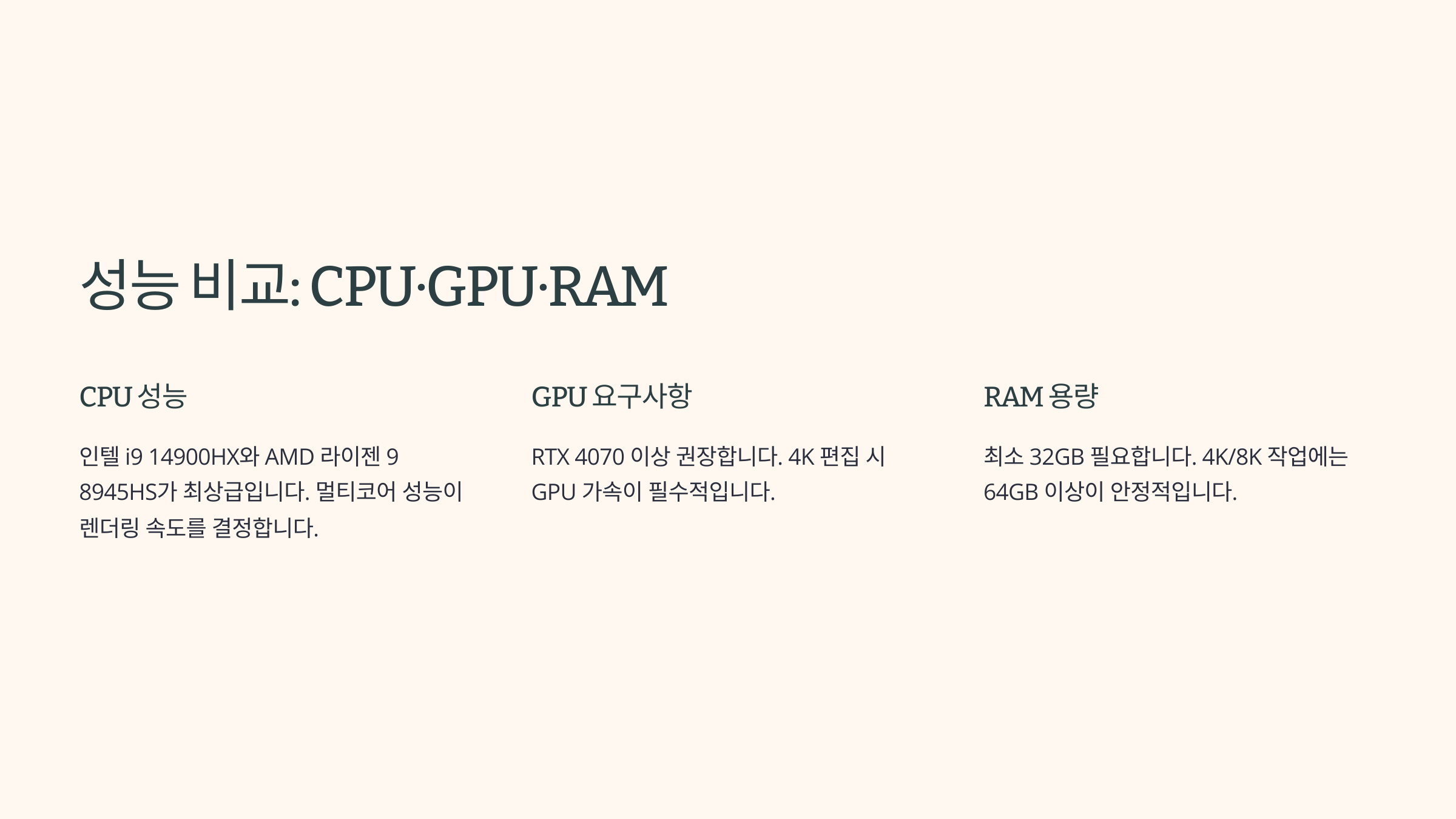 예를 들어 단순 컷 편집과 색보정 정도라면 RTX 4050~4060 급 GPU와 i7 혹은 Ryzen 7 CPU만으로도 충분해요. 반면, 다중 트랙, 고해상도, 효과 렌더링이 많다면 RTX 4080 이상이 필요하죠.