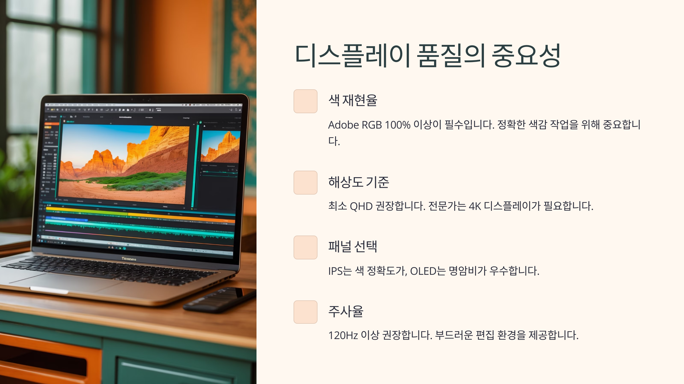 영상 편집에서 디스플레이는 그냥 화면이 아니라 '작업 공간'이에요. 그래서 색 정확도와 밝기, 해상도는 성능 못지않게 중요한 요소예요. 편집 화면이 실제 결과물과 차이 나면 낭패거든요. 🎨