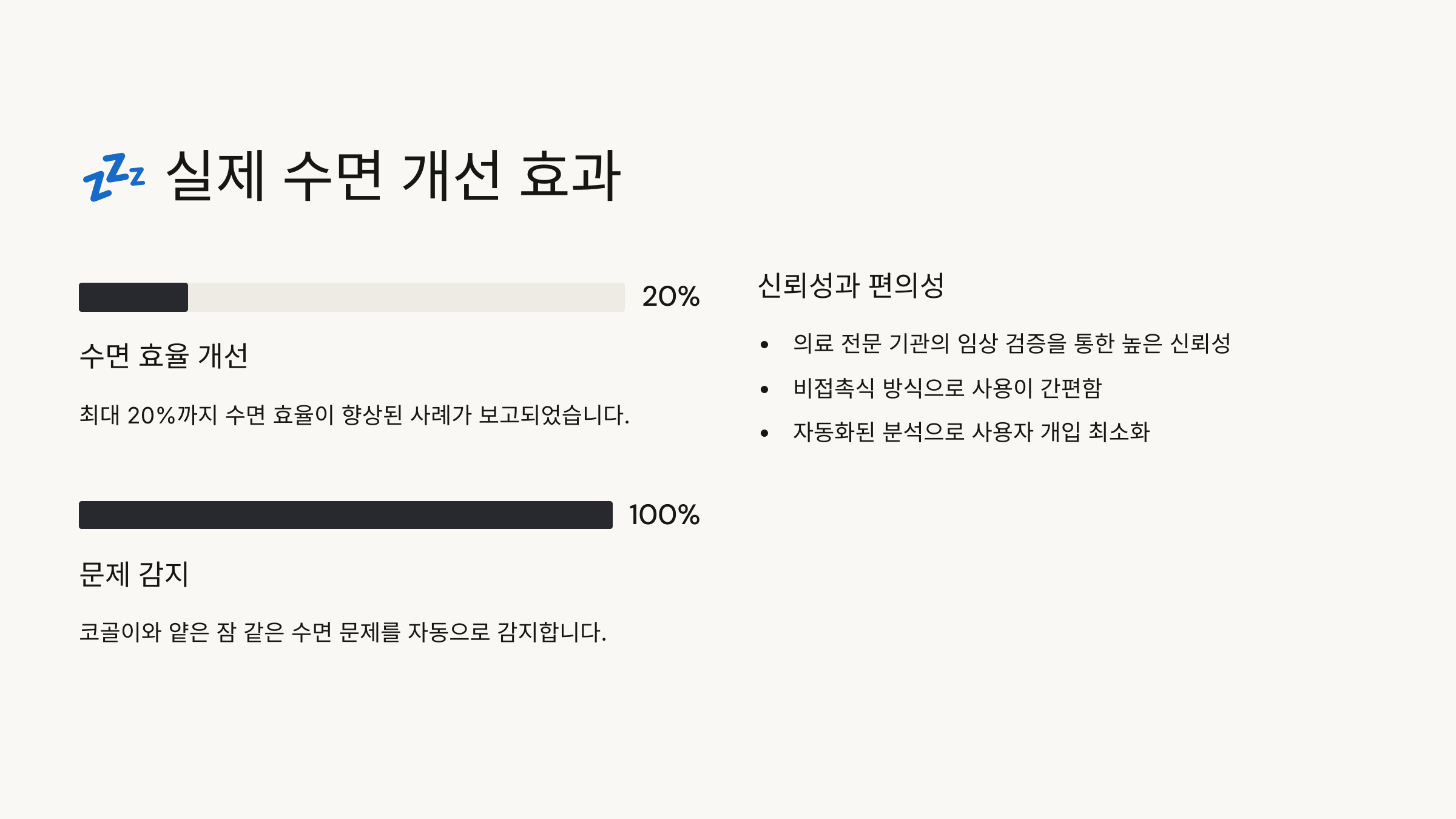 | 사용자 후기 | 잠드는 시간, 코골이, 아침 컨디션 모두 개선 |