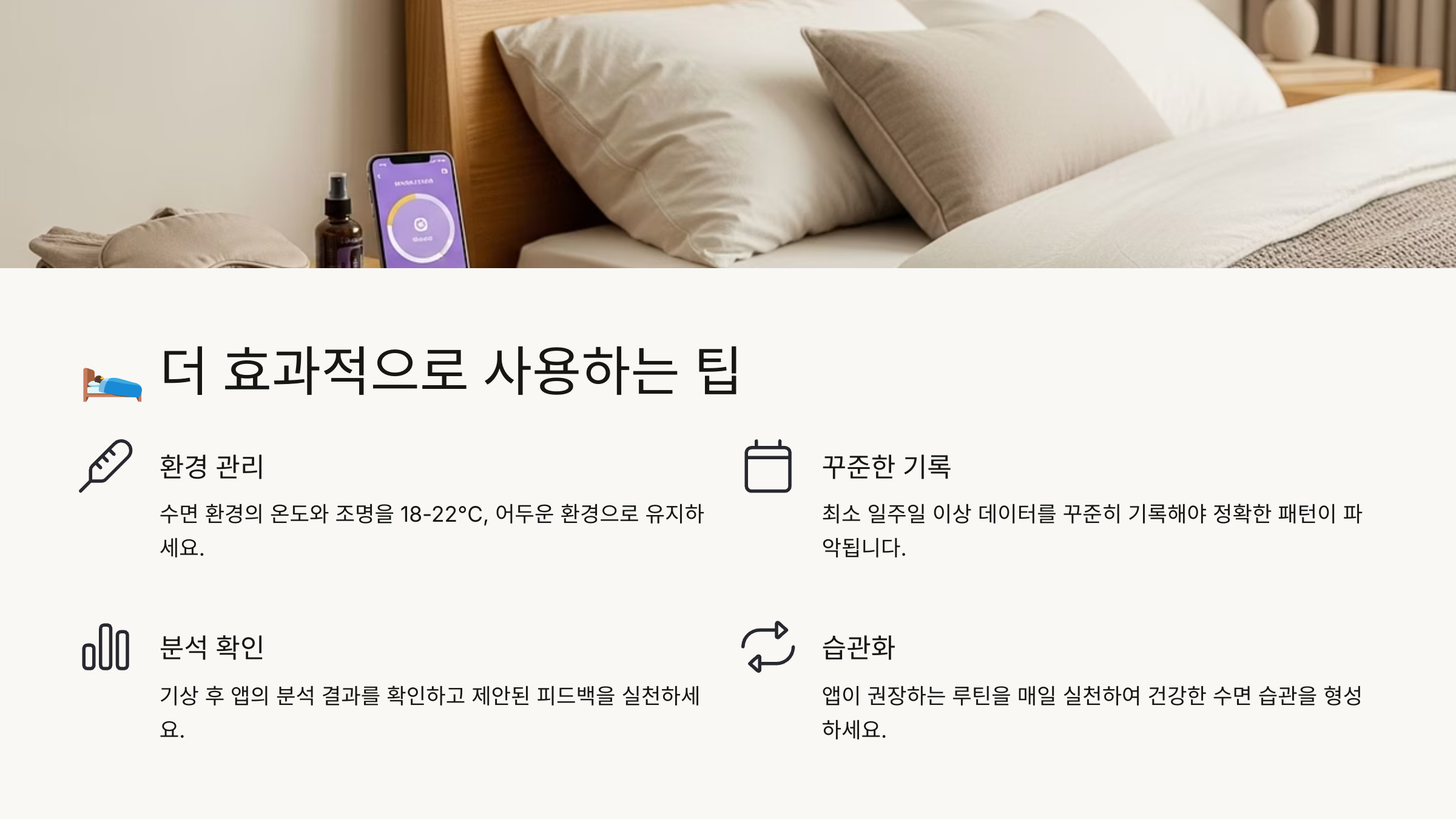 여섯 번째는 ‘수면 환경 최적화’예요. 앱이 제안하는 온도, 습도, 조도 조건을 확인해서 수면 공간을 조정하면 더 깊은 수면에 도움이 돼요. 특히 여름철엔 온도 조절이 핵심이에요.