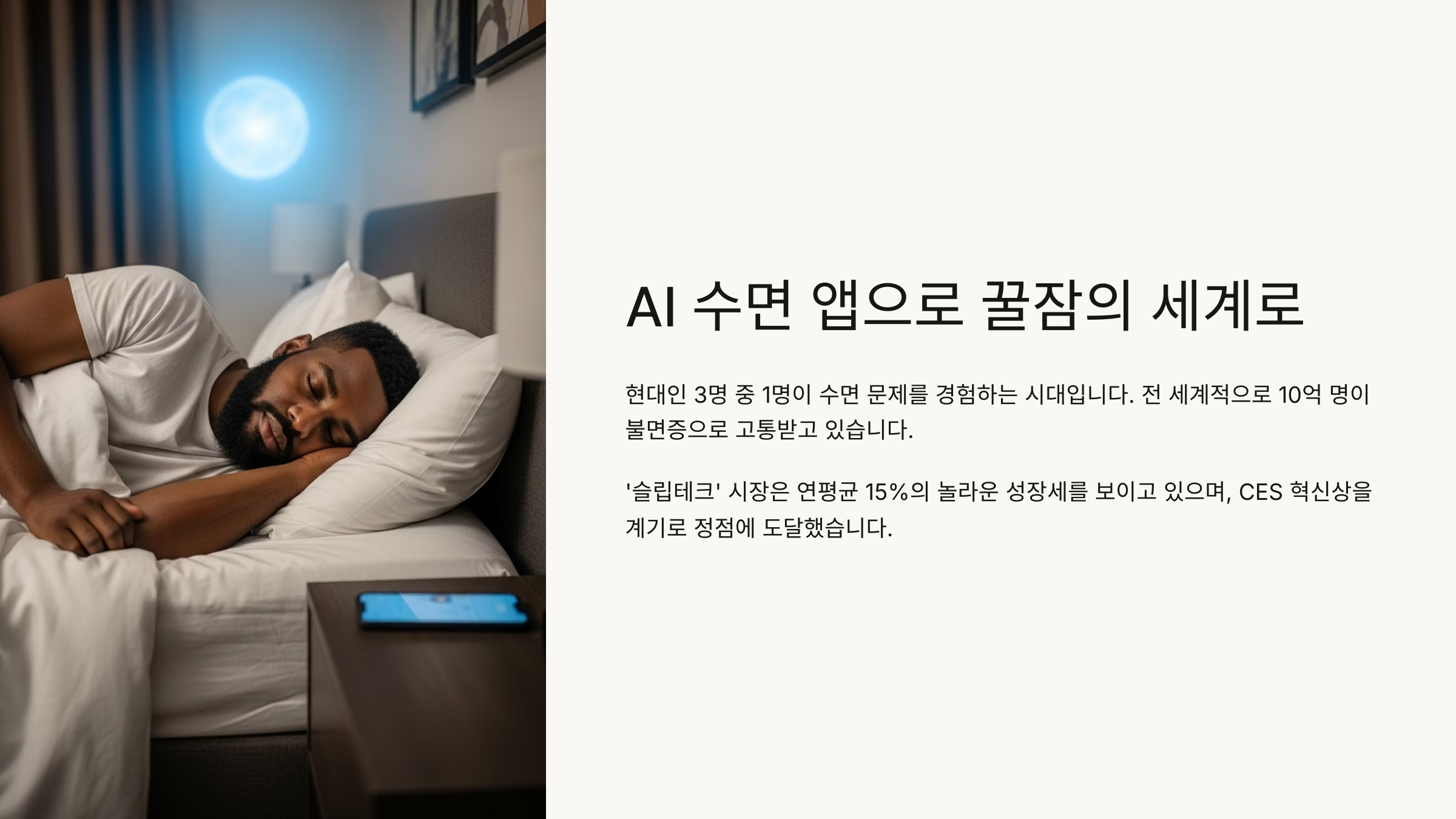 불면증이나 야간 각성 같은 문제로 잠을 못 이루는 사람들이 늘어나면서, 단순한 수면 시간보다는 '수면의 질'이 중요하다는 인식이 생겨났어요. 바로 이 시점에서 AI 기술이 수면 솔루션에 접목되기 시작한 거예요.